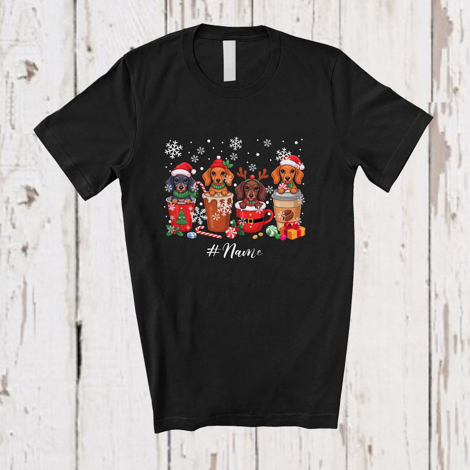 Personalized Custom Name Four X-mas Dachshund In Coffee Collection; Lovely Christmas Family T-Shirt. This cotton t-shirt is a durable staple product with a classic fit. One of the most popular items, it has a relaxed style made for everyday and casual wear.