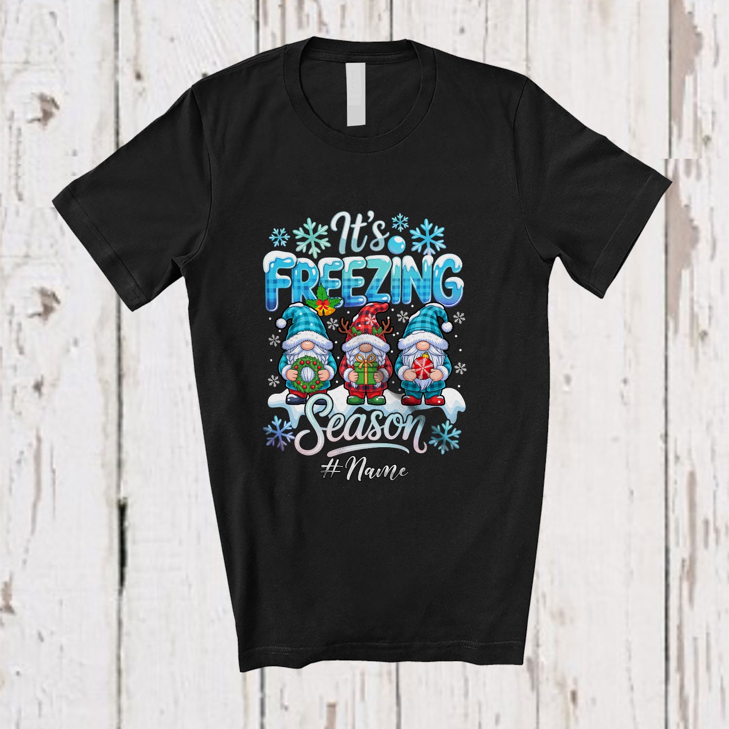 Personalized Custom Name Freezing Season; Lovely Christmas Winter Snow Plaid Three Cold Gnomes T-Shirt