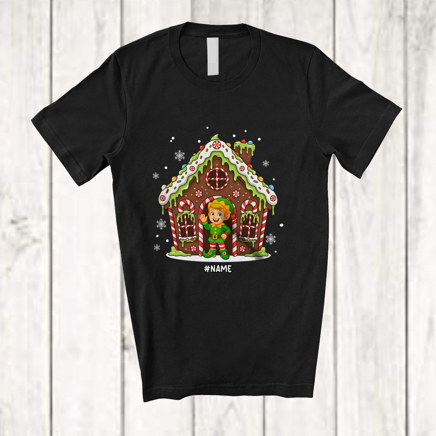 Personalized Custom Name Gingerbread House With Elf; Merry Christmas Candy Canes Baker T-Shirt. This cotton t-shirt is a durable staple product with a classic fit. One of the most popular items, it has a relaxed style made for everyday and casual wear.