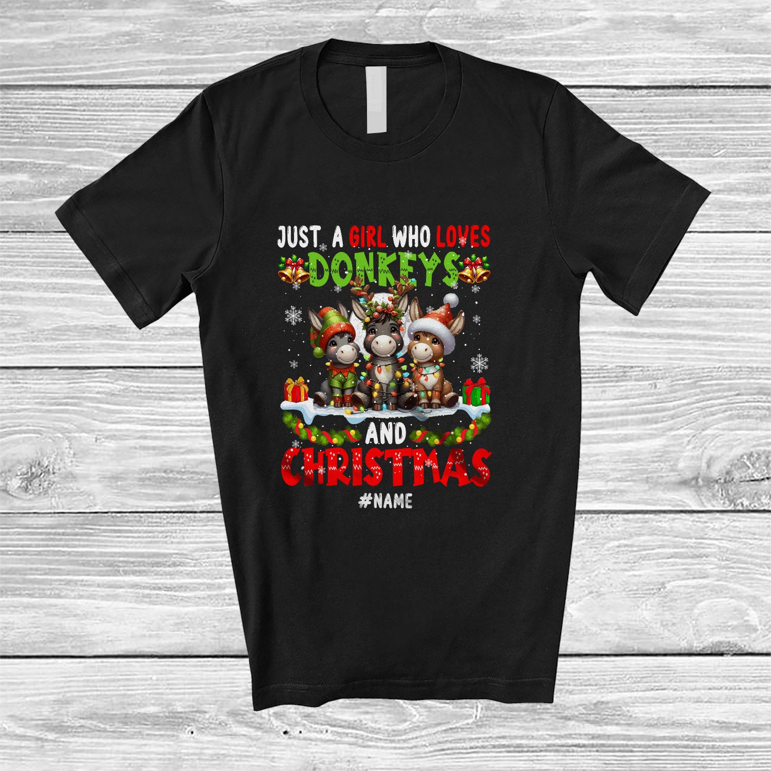 Personalized Custom Name Girl Who Loves Donkeys Christmas; Lovely Lights Three Donkey Farmer T-Shirt
