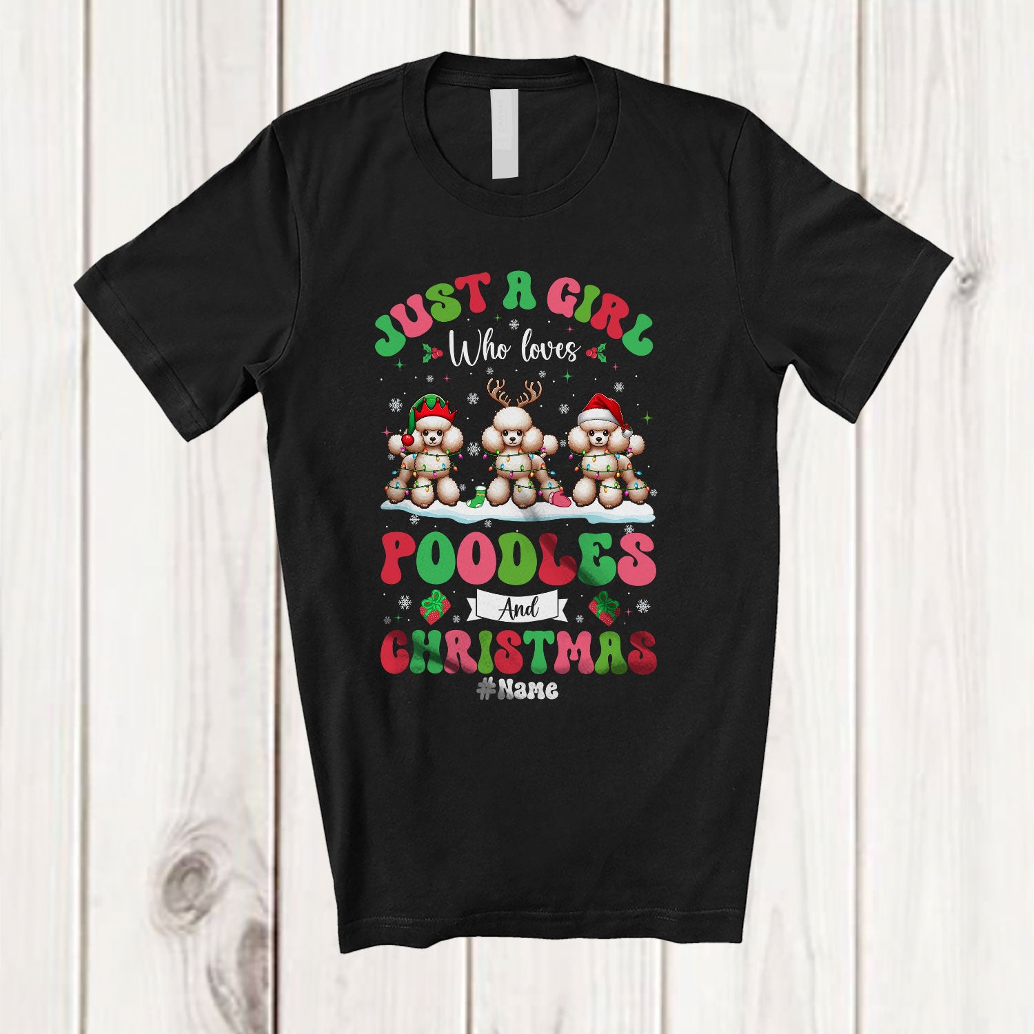 • Personalized Custom Name Girl Who Loves Poodles Christmas; Amazing X-mas Snow Lights T-Shirt. This cotton t-shirt is a durable staple product with a classic fit. One of the most popular items, it has a relaxed style made for everyday and casual wear.