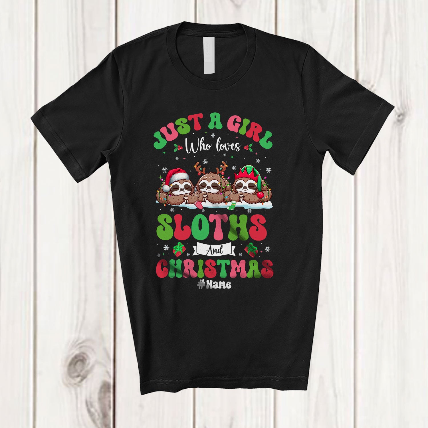 Personalized Custom Name Girl Who Loves Sloths Christmas; Amazing X-mas Snow Lights T-Shirt
