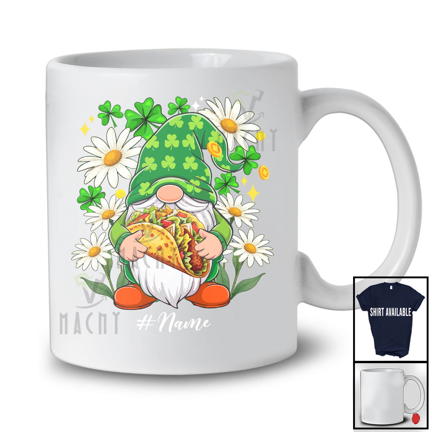 Personalized Custom Name Gnome Holding Taco Daisy; Lovely St. Patrick's Day Shamrocks T-Shirt. This cotton t-shirt is a durable staple product with a classic fit. One of the most popular items, it has a relaxed style made for everyday and casual wear.