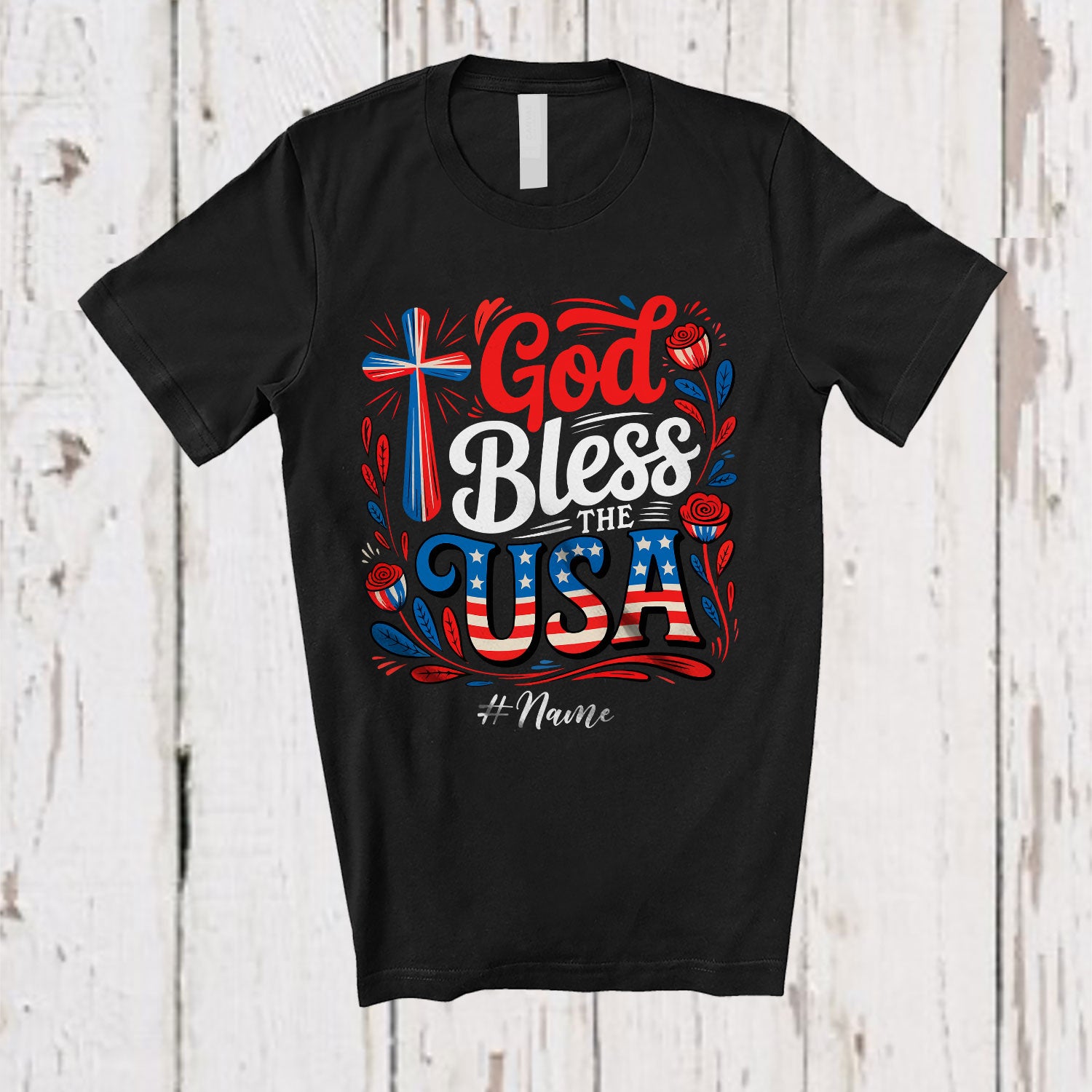 Personalized Custom Name God Bless The USA; Fantastic 4th of July US Flag Cross; Patriotic T-Shirt