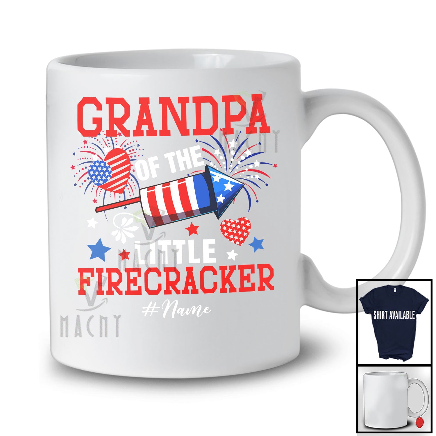 Personalized Custom Name Grandpa Of The Little Firecracker; Lovely 4th Of July Family Patriotic T-Shirt. This cotton t-shirt is a durable staple product with a classic fit. One of the most popular items, it has a relaxed style made for everyday and casual wear.