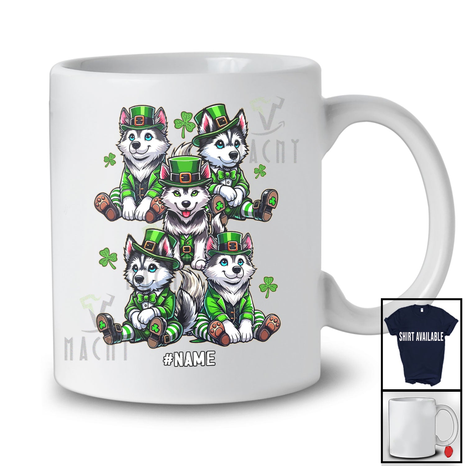 Personalized Custom Name Group Husky Leprechaun; Lovely St. Patrick's Day Shamrocks T-Shirt. This cotton t-shirt is a durable staple product with a classic fit. One of the most popular items, it has a relaxed style made for everyday and casual wear.