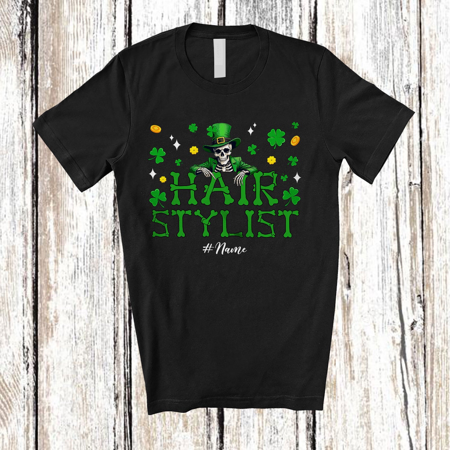• Personalized Custom Name Hair Stylist; Fantastic St. Patrick's Day Leprechaun Skeleton T-Shirt. This cotton t-shirt is a durable staple product with a classic fit. One of the most popular items, it has a relaxed style made for everyday and casual wear.