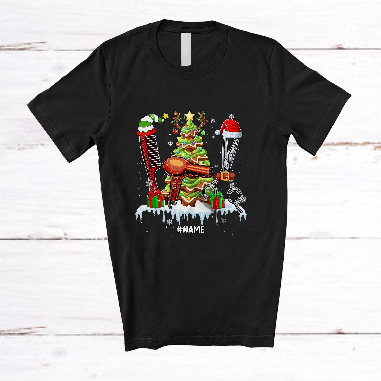 Personalized Custom Name Hair Stylist Tools Christmas Tree Santa Elf; Proud X-mas Snowing; Jobs T-Shirt