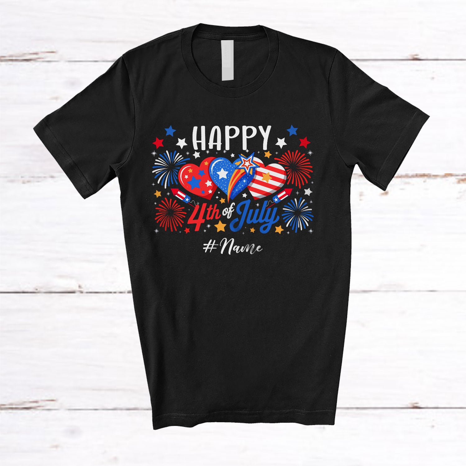 • Personalized Custom Name Happy 4th of July; Amusing Hearts Fireworks Patriotic T-Shirt. This cotton t-shirt is a durable staple product with a classic fit. One of the most popular items, it has a relaxed style made for everyday and casual wear.