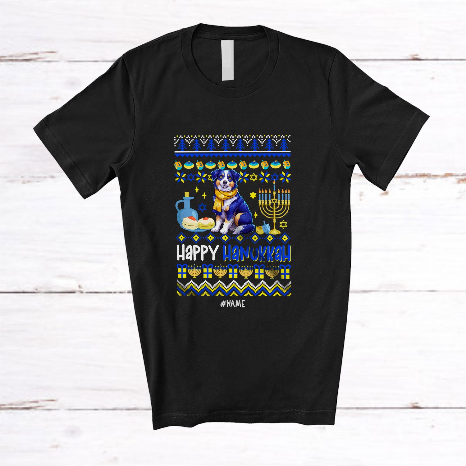 Personalized Custom Name Happy Hanukkah; Lovely Chanukah Sweater Lights Australian Shepherd T-Shirt