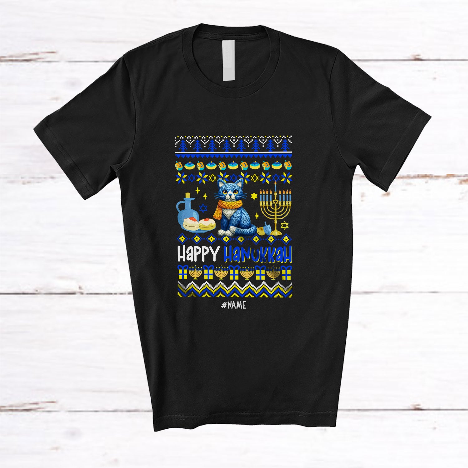 • Personalized Custom Name Happy Hanukkah; Lovely Chanukah Sweater Lights Cat T-Shirt. This cotton t-shirt is a durable staple product with a classic fit. One of the most popular items, it has a relaxed style made for everyday and casual wear.