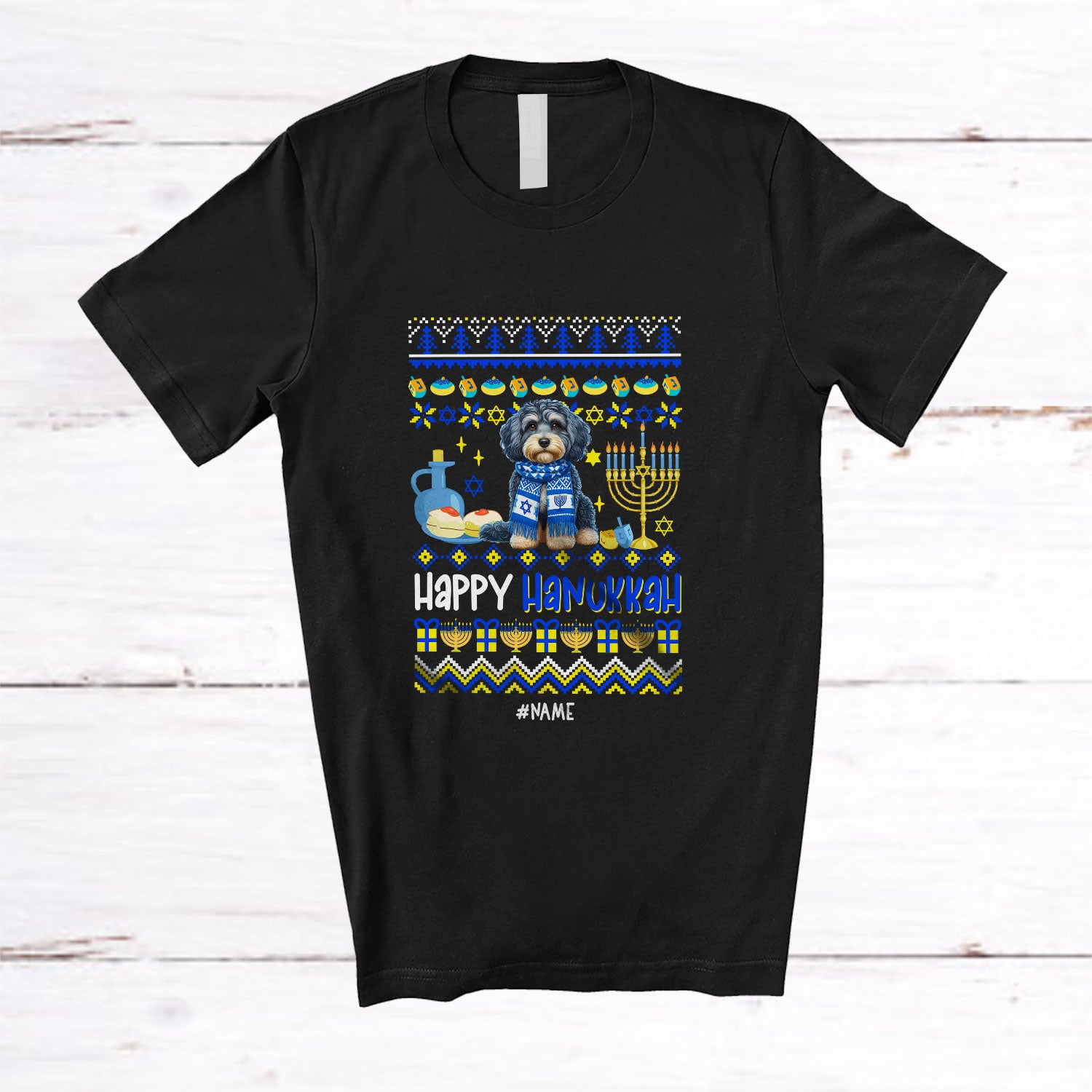Personalized Custom Name Happy Hanukkah; Lovely Chanukah Sweater Lights Sproodle T-Shirt. This cotton t-shirt is a durable staple product with a classic fit. One of the most popular items, it has a relaxed style made for everyday and casual wear.