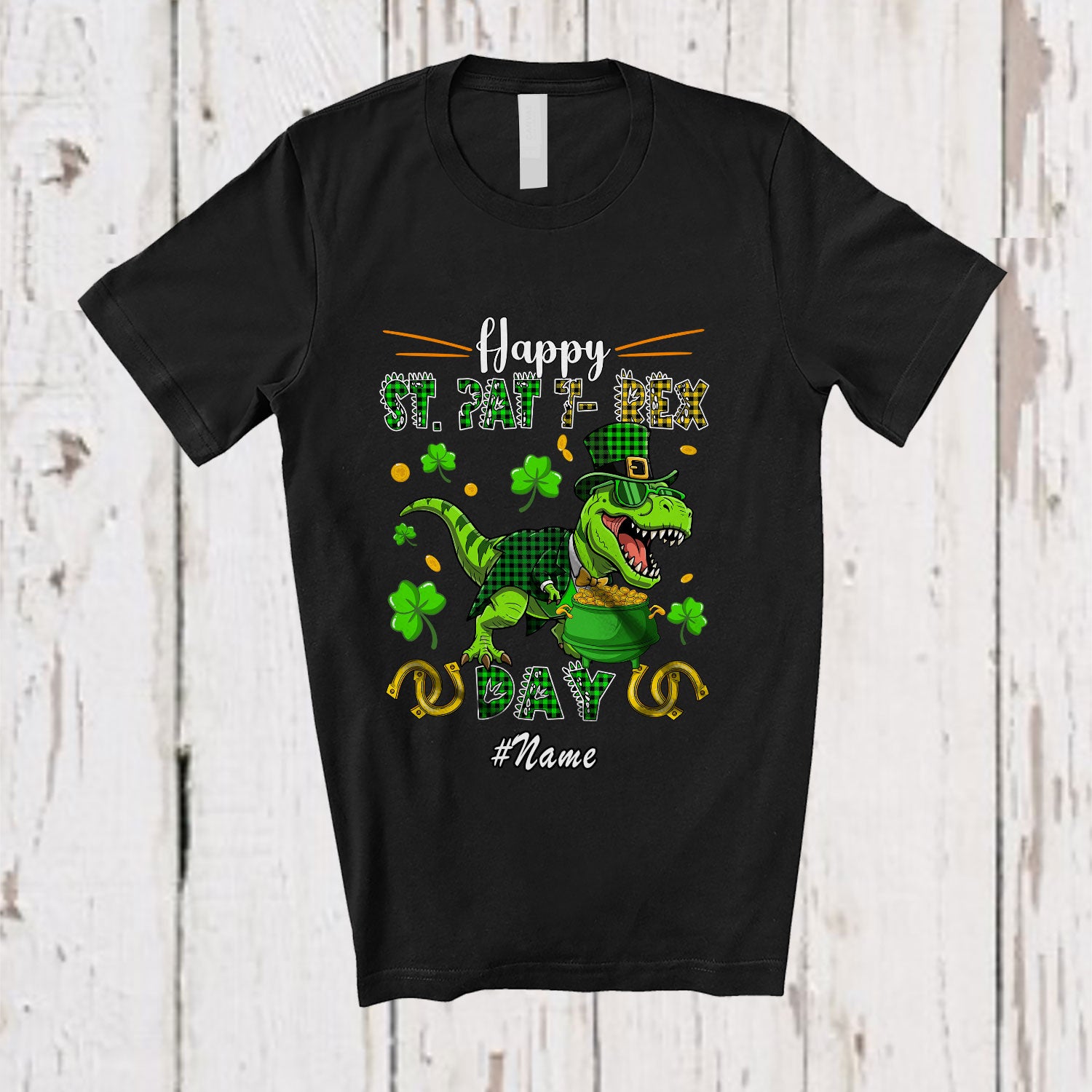 Personalized Custom Name Happy St. Pat T-Rex Day; Humorous St. Patrick's Day Plaid T-Rex Lover T-Shirt. This cotton t-shirt is a durable staple product with a classic fit. One of the most popular items, it has a relaxed style made for everyday and casual wear.