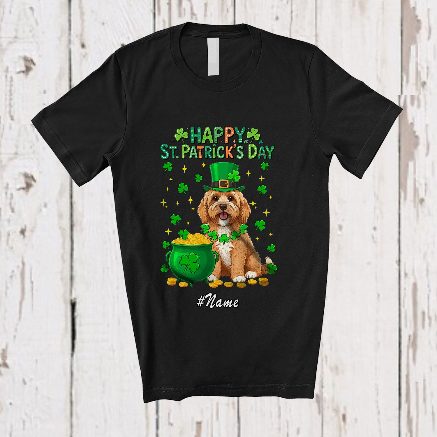 • Personalized Custom Name Happy St. Patrick's Day; Adorable Irish Shamrock Cockapoo Owner T-Shirt. This cotton t-shirt is a durable staple product with a classic fit. One of the most popular items, it has a relaxed style made for everyday and casual wear.