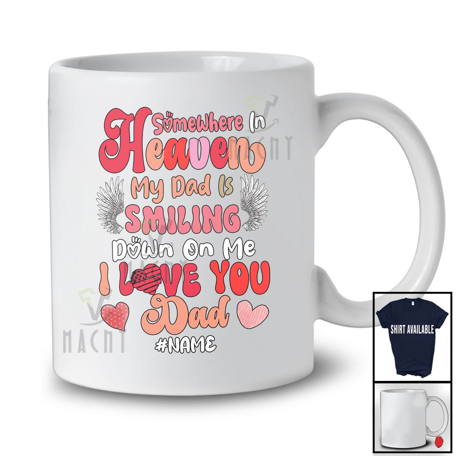 The Personalized Custom Name Heaven My Dad is Smiling; Joyful Father's Day Memory Family T-Shirt destined to impress, and priced at only $12.95, for a limited time.