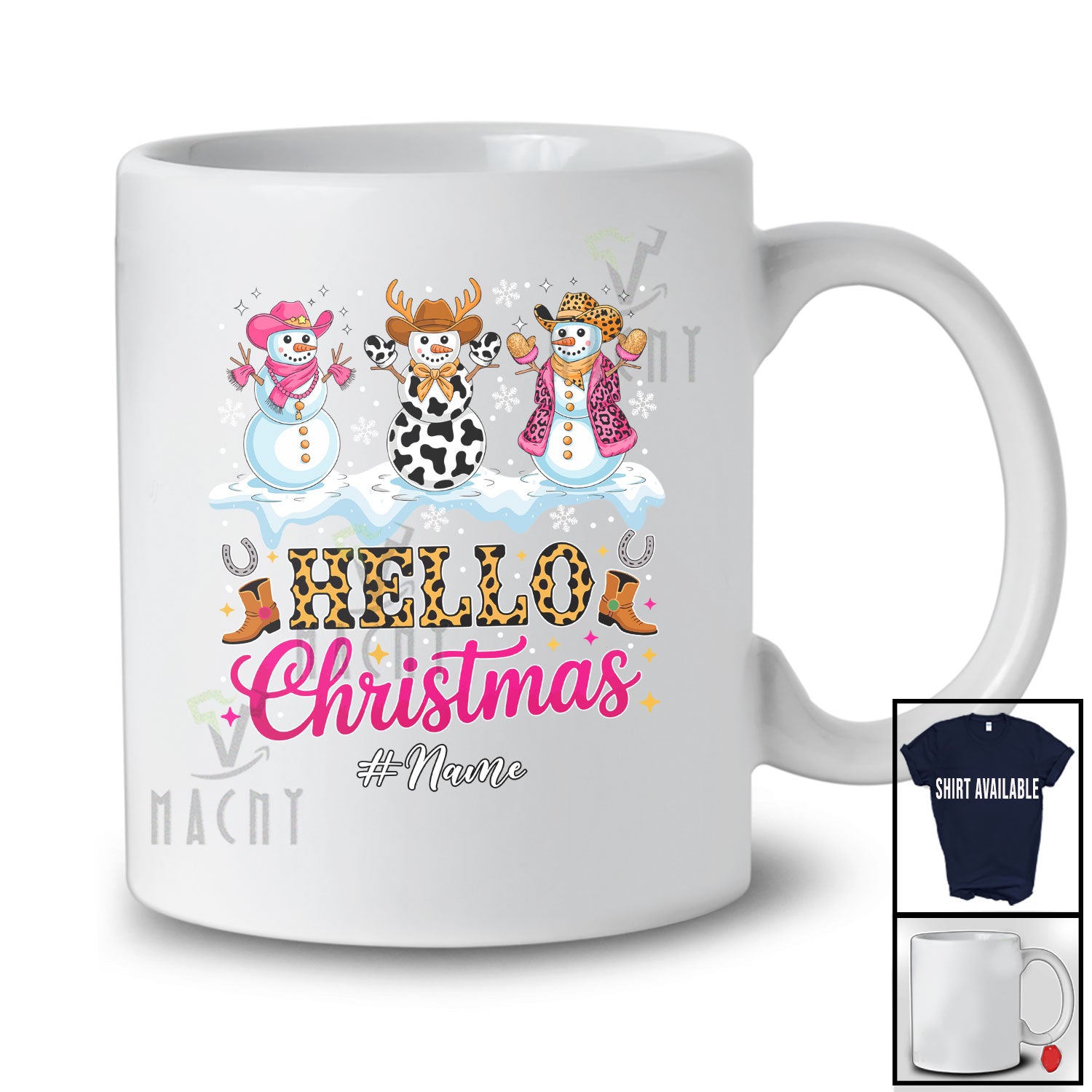 Personalized Custom Name Hello Christmas; Joyful X-mas Three Cowgirl Snowman Pink Leopard T-Shirt. This cotton t-shirt is a durable staple product with a classic fit. One of the most popular items, it has a relaxed style made for everyday and casual wear.