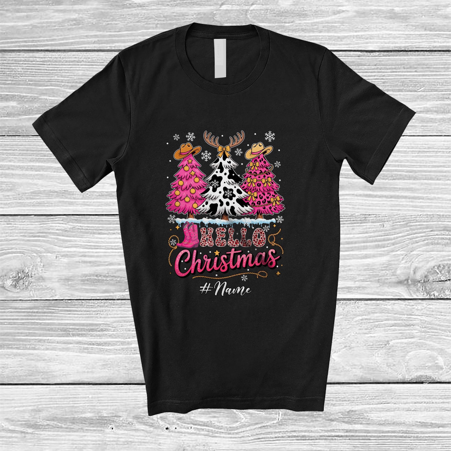 Personalized Custom Name Hello Christmas; Lovely Three Leopard Cowboy X-mas Tree; Family T-Shirt