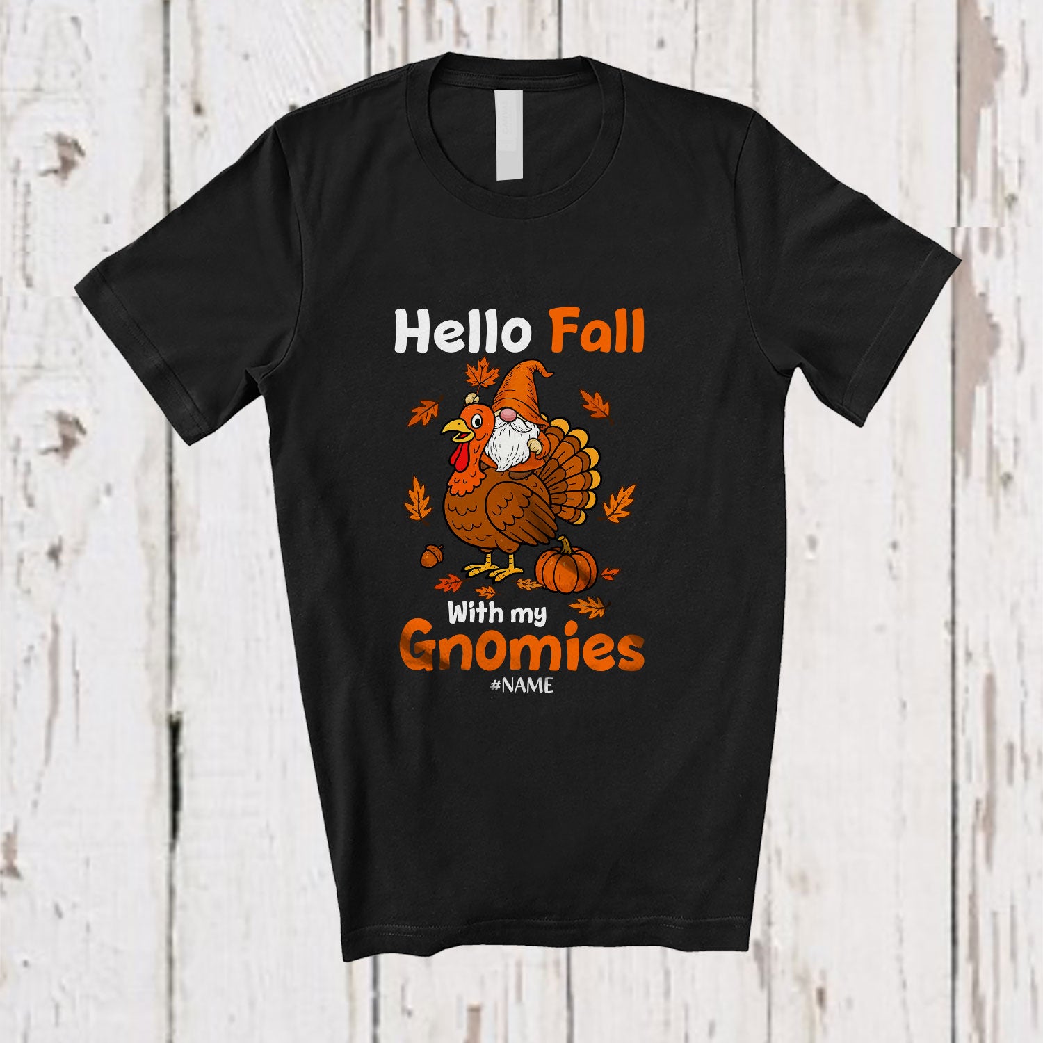Personalized Custom Name Hello Fall With My Gnomies; Amusing Thanksgiving Gnome Riding Turkey T-Shirt. This cotton t-shirt is a durable staple product with a classic fit. One of the most popular items, it has a relaxed style made for everyday and casual wear.
