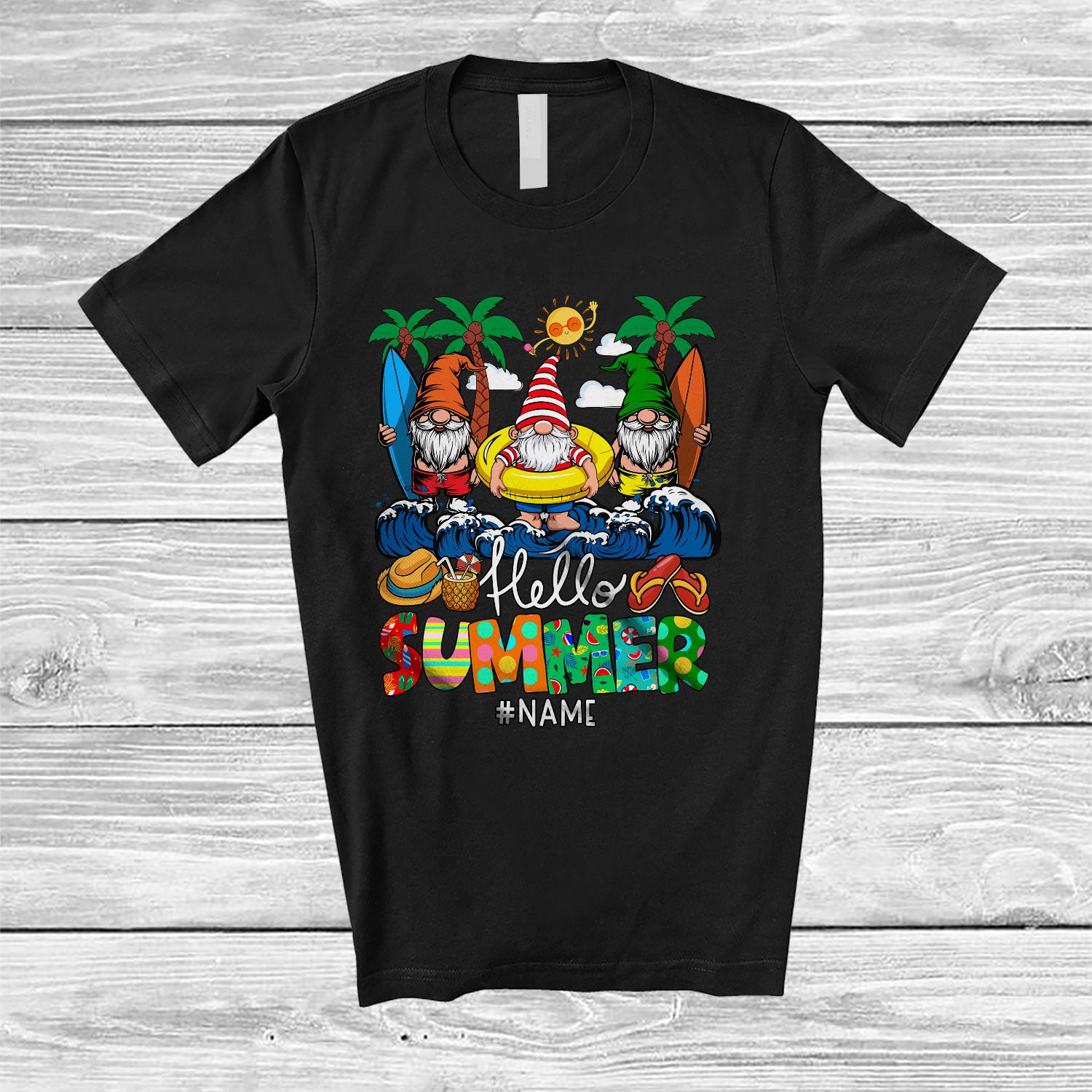 Personalized Custom Name Hello Summer; Colorful Summer Vacation Three Gnomes Surfing T-Shirt. This cotton t-shirt is a durable staple product with a classic fit. One of the most popular items, it has a relaxed style made for everyday and casual wear.