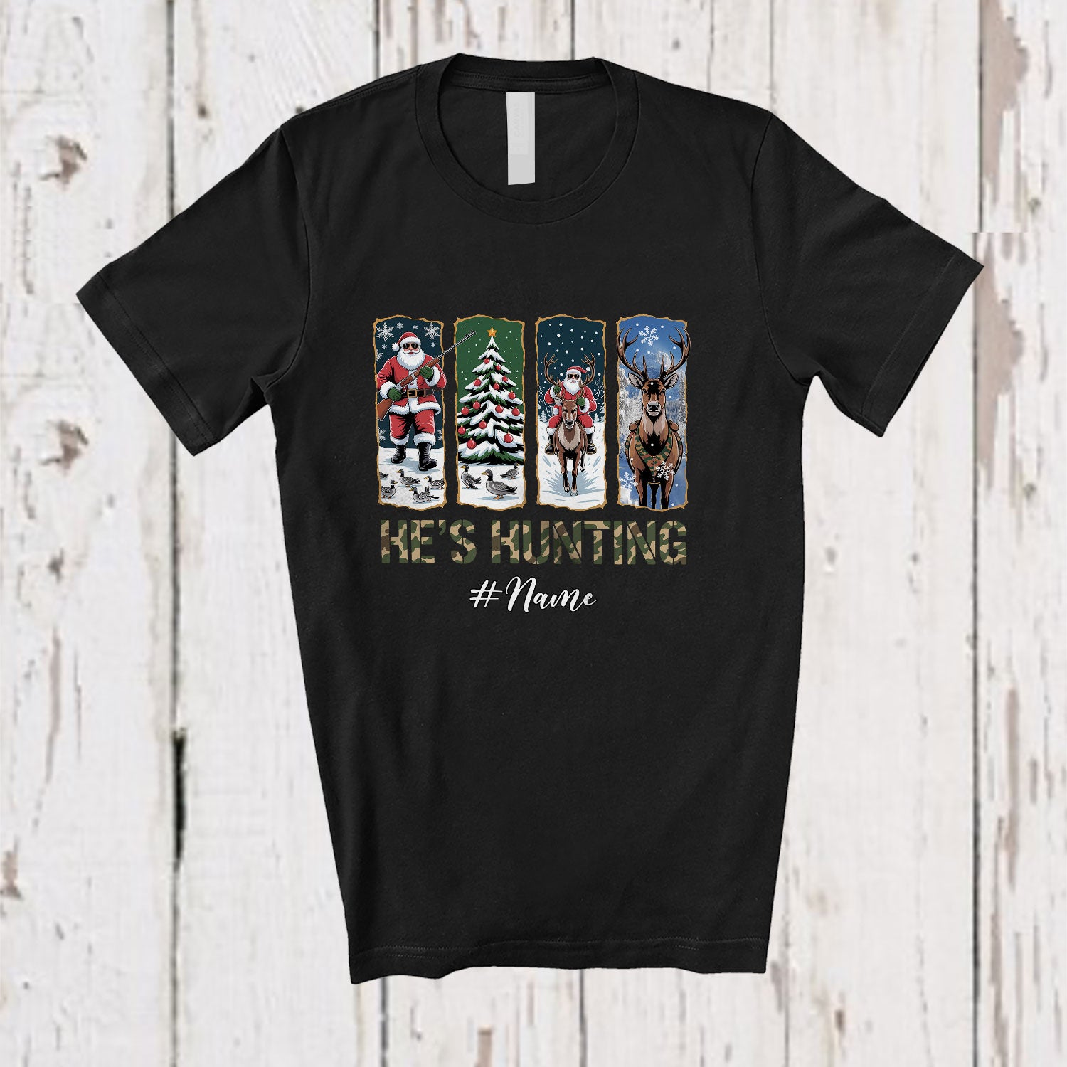 • Personalized Custom Name He's Hunting; Humorous Christmas Santa Hunting Reindeer; Hunter T-Shirt. This cotton t-shirt is a durable staple product with a classic fit. One of the most popular items, it has a relaxed style made for everyday and casual wear.