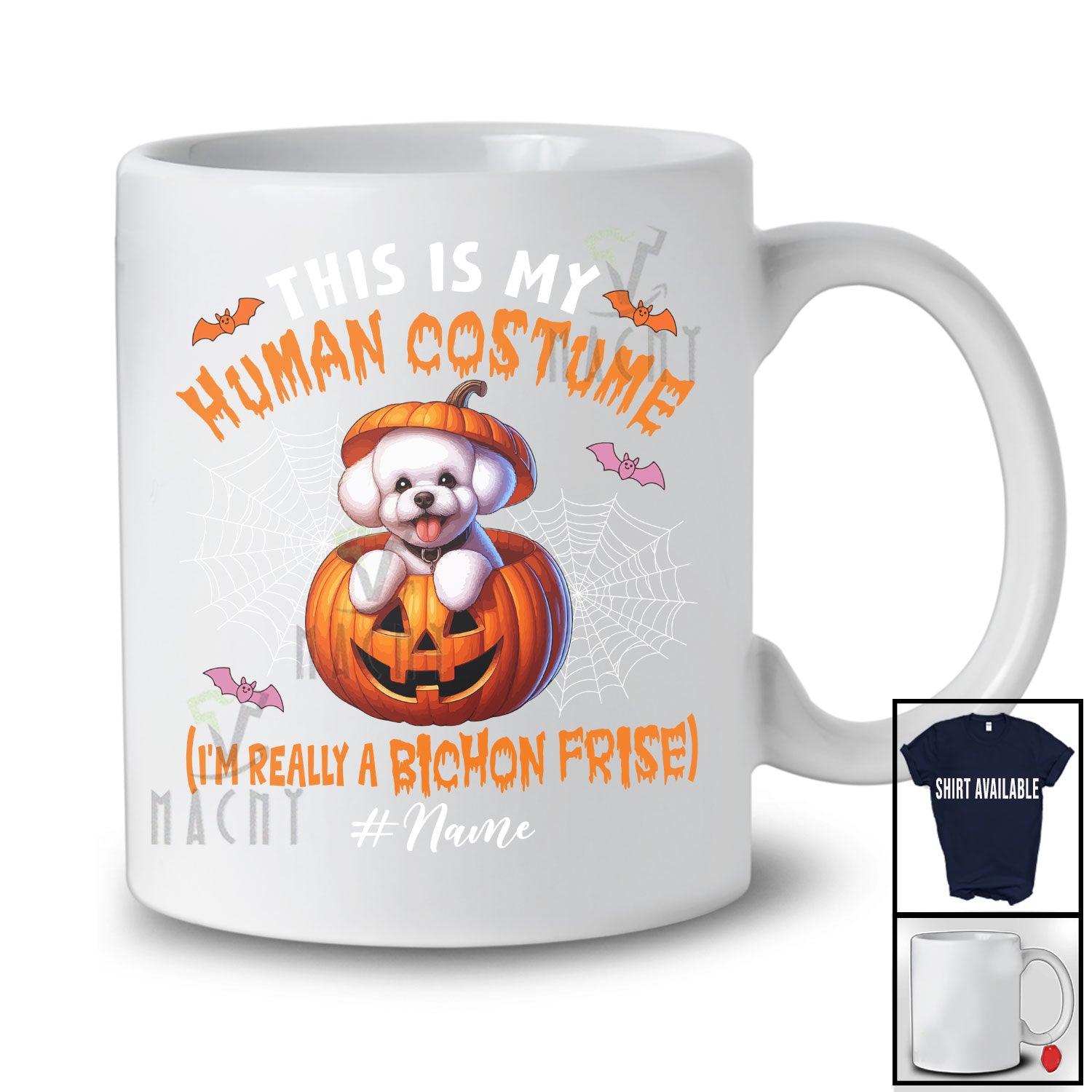 • Personalized Custom Name Human Costume I'm Really A Bichon Frise; Creepy Halloween Pumpkin T-Shirt. This cotton t-shirt is a durable staple product with a classic fit. One of the most popular items, it has a relaxed style made for everyday and casual wear.