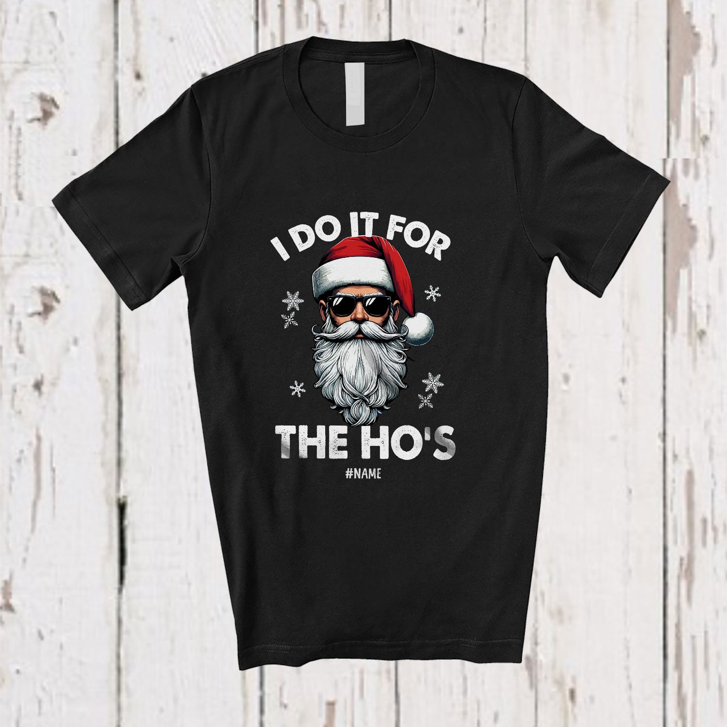 • Personalized Custom Name I Do It For The Ho's; Amazing Christmas Santa Face Adult; Pajama Family T-Shirt. This cotton t-shirt is a durable staple product with a classic fit. One of the most popular items, it has a relaxed style made for everyday and casual wear.