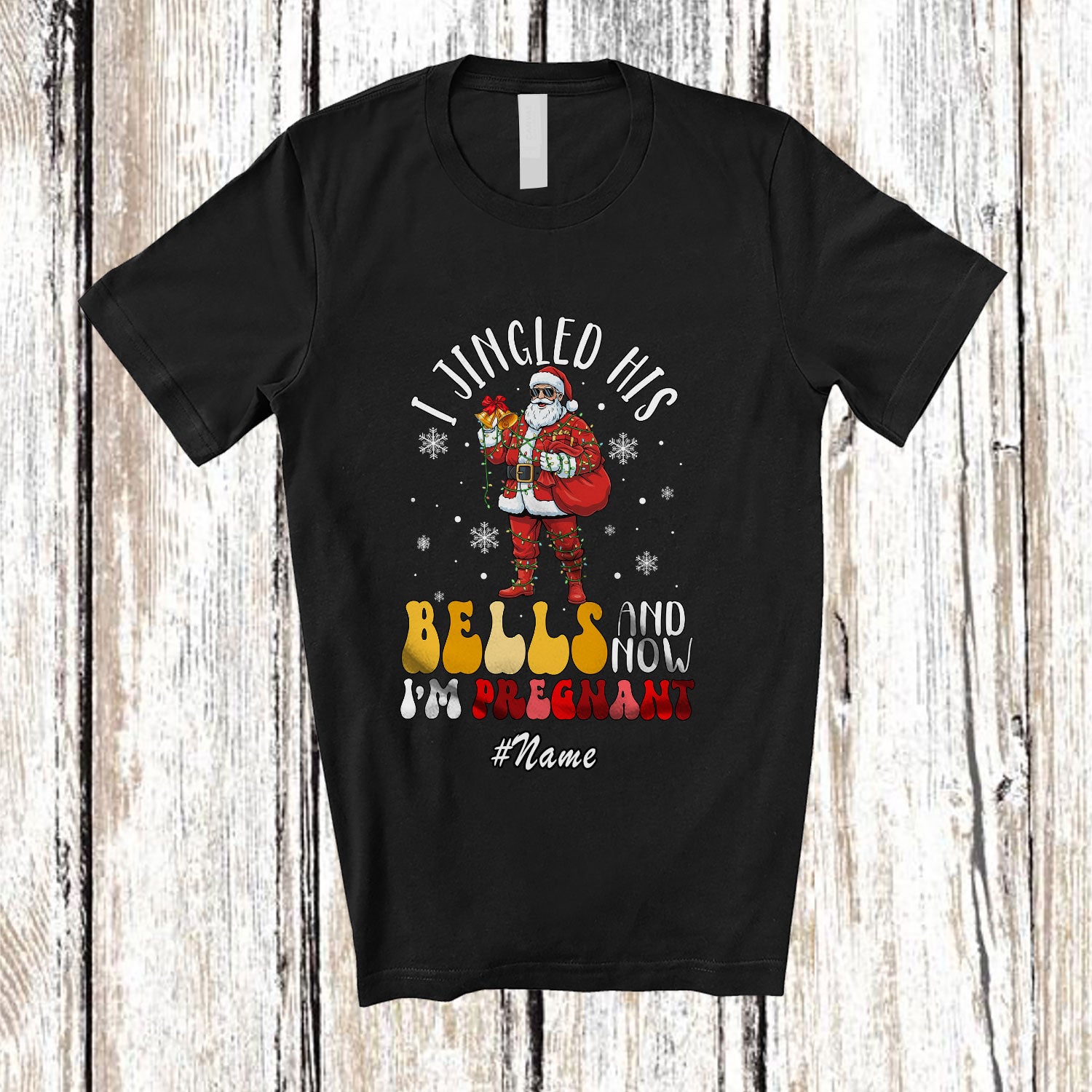 • Personalized Custom Name I Jingled His Bells Pregnant; Humorous Christmas Santa Pregnancy T-Shirt. This cotton t-shirt is a durable staple product with a classic fit. One of the most popular items, it has a relaxed style made for everyday and casual wear.