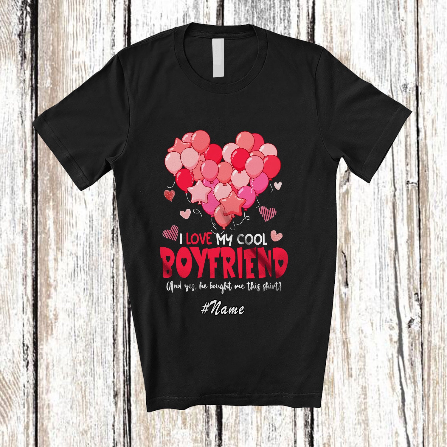 Personalized Custom Name I Love My Cool Boyfriend; Lovely Valentine Balloon Heart Shape; Couple T-Shirt. This cotton t-shirt is a durable staple product with a classic fit. One of the most popular items, it has a relaxed style made for everyday and casual wear.