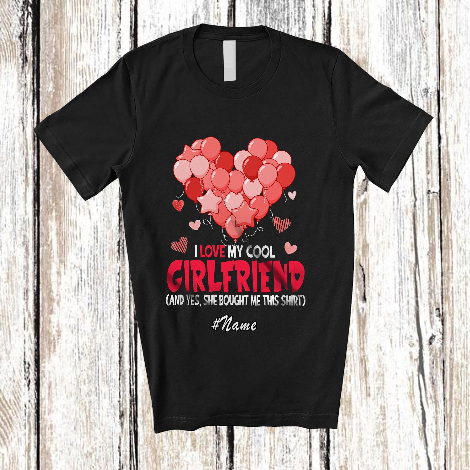 • Personalized Custom Name I Love My Cool Girlfriend; Lovely Valentine Balloon Heart Shape; Couple T-Shirt. This cotton t-shirt is a durable staple product with a classic fit. One of the most popular items, it has a relaxed style made for everyday and casual wear.