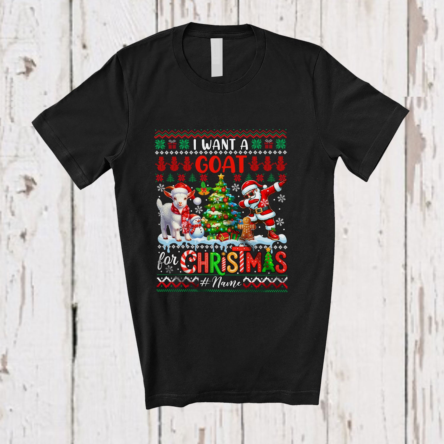 Personalized Custom Name I Want A Goat For Christmas; Cheerful Sweater Dabbing Santa T-Shirt