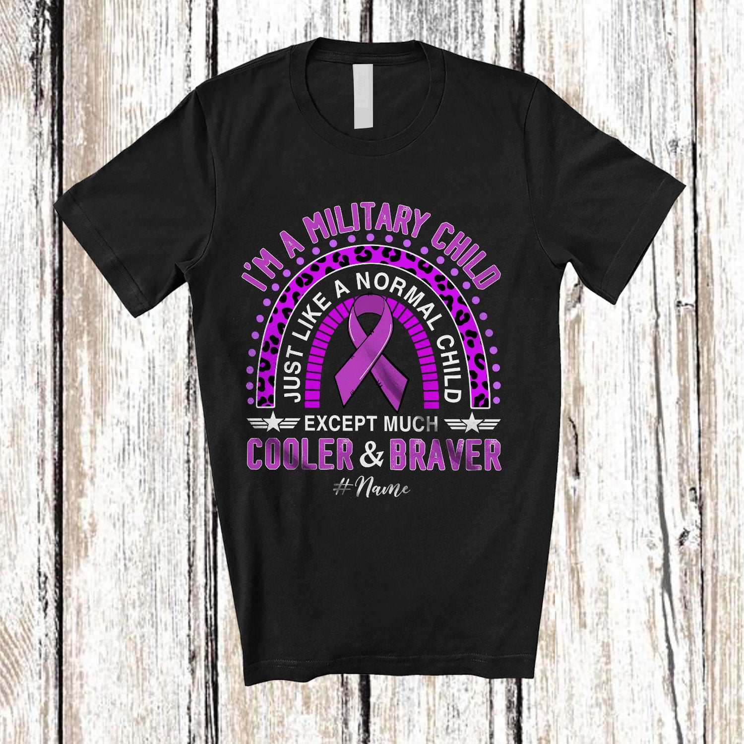 Personalized Custom Name I'm A Military Child Month; Lovely Purple Ribbon Leopard Rainbow T-Shirt. This cotton t-shirt is a durable staple product with a classic fit. One of the most popular items, it has a relaxed style made for everyday and casual wear.