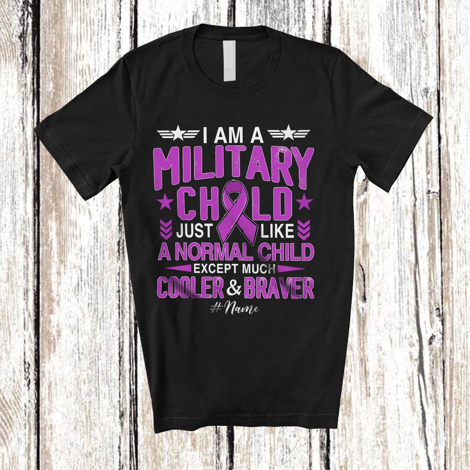 • Personalized Custom Name I'm A Military Child Month; Lovely Purple Ribbon Patriotic Family T-Shirt. This cotton t-shirt is a durable staple product with a classic fit. One of the most popular items, it has a relaxed style made for everyday and casual wear.