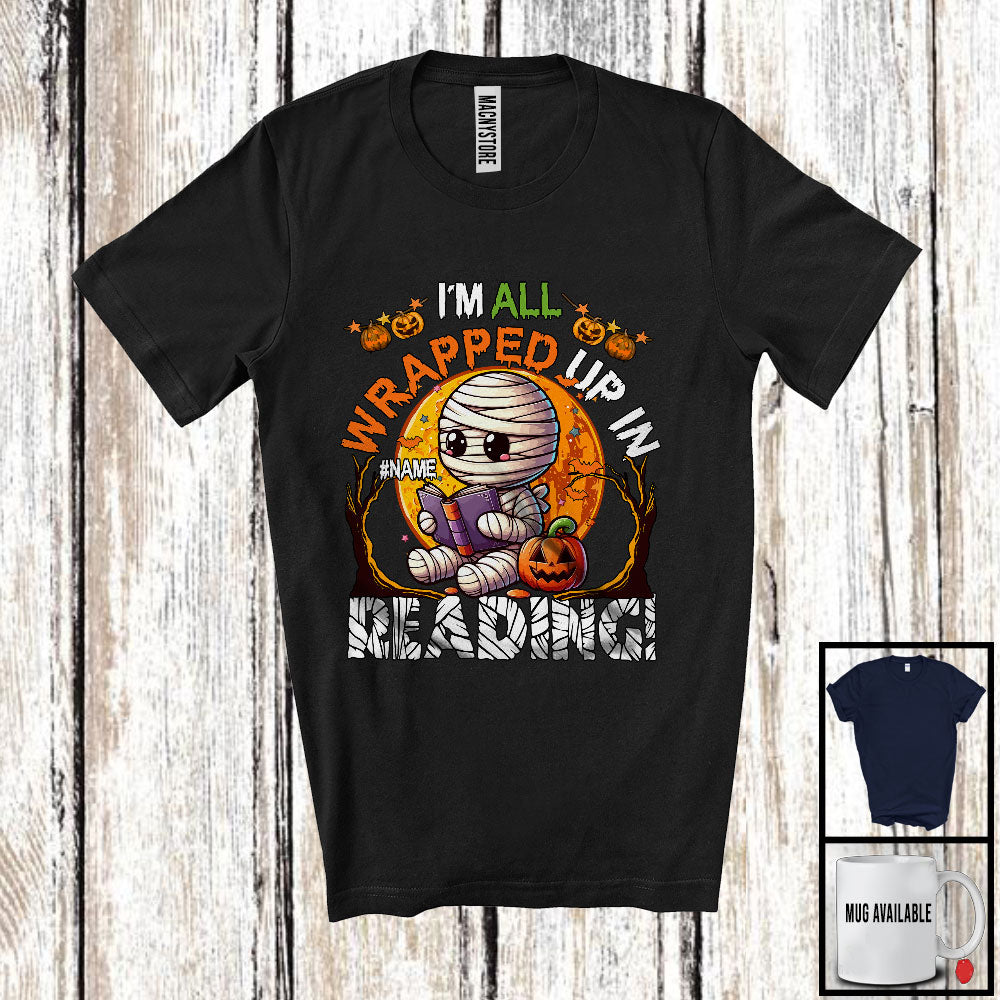 Personalized Custom Name I'm All Wrapped Up In Reading; Scary Halloween Moon Mummy Book Nerd T-Shirt