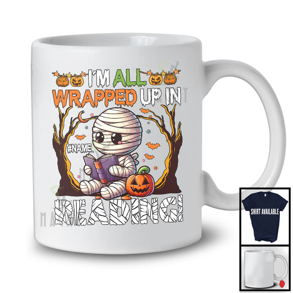 Personalized Custom Name I'm All Wrapped Up In Reading; Scary Halloween Mummy Book Nerd T-Shirt