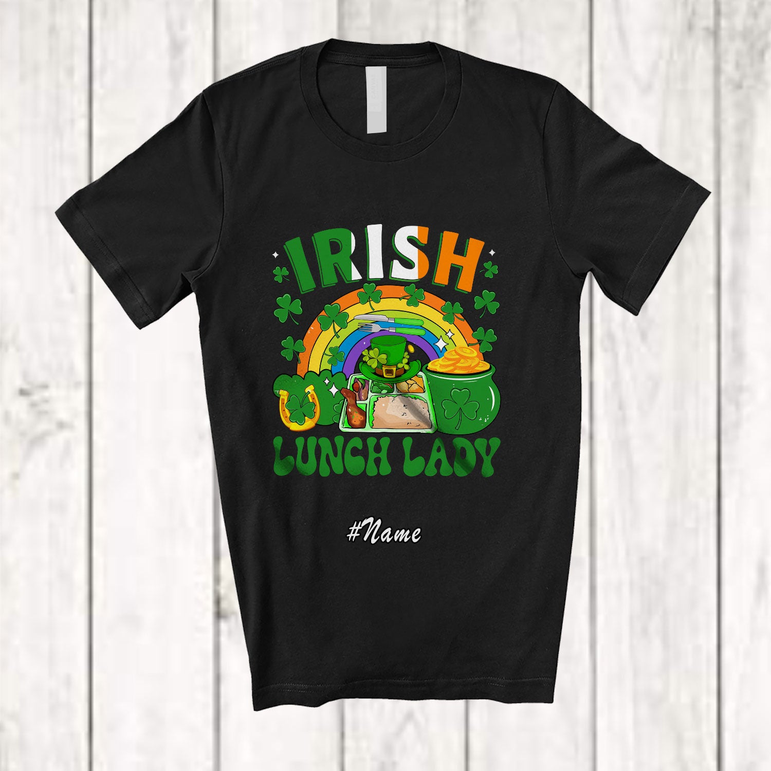 Personalized Custom Name Irish Lunch Lady; Amazing St. Patrick's Day Girls Rainbow; Lucky Shamrock T-Shirt. This cotton t-shirt is a durable staple product with a classic fit. One of the most popular items, it has a relaxed style made for everyday and casual wear.