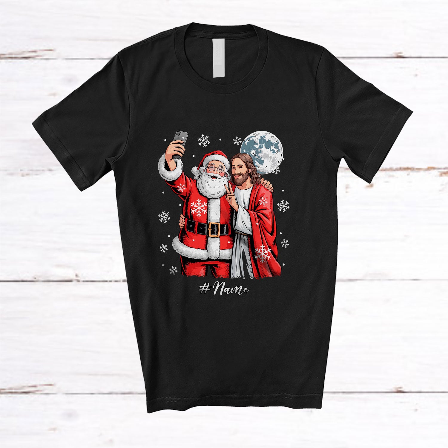 Personalized Custom Name Jesus And Santa Selfie; Humorous Christmas Moon; Family Friends Group T-Shirt