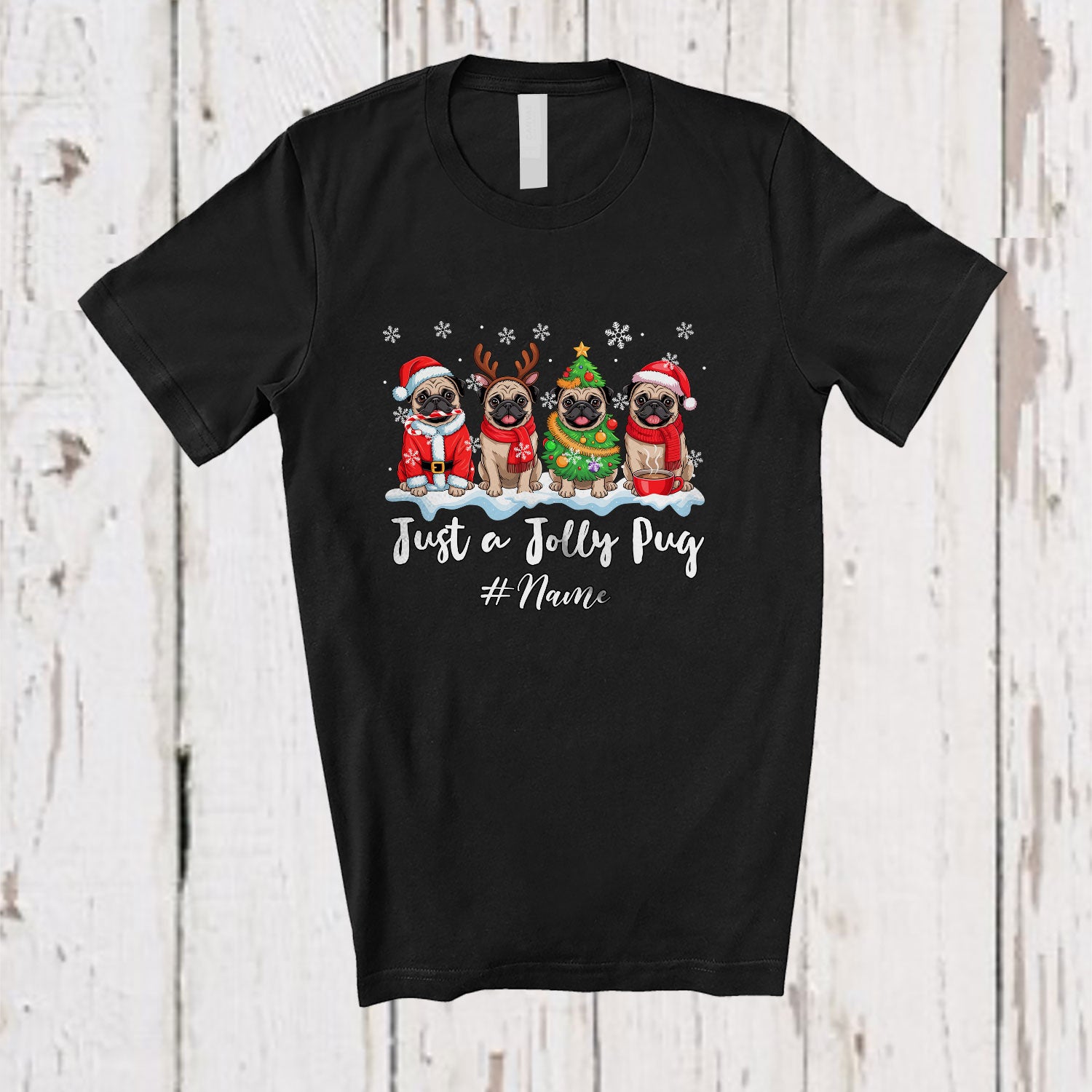Personalized Custom Name Just A Jolly Pug; Awesome Christmas Four Pug Owner; Family T-Shirt. This cotton t-shirt is a durable staple product with a classic fit. One of the most popular items, it has a relaxed style made for everyday and casual wear.