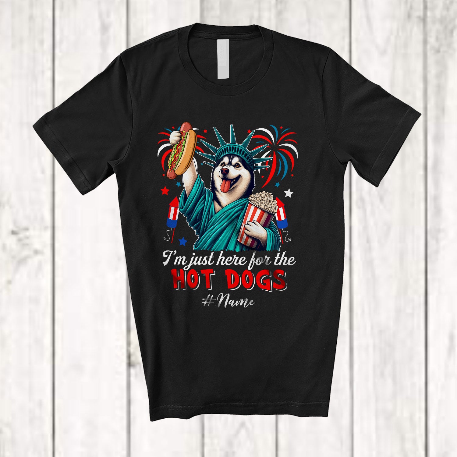 • Personalized Custom Name Just Here For The Hot Dogs; Proud Husky Liberty Patriotic T-Shirt. This cotton t-shirt is a durable staple product with a classic fit. One of the most popular items, it has a relaxed style made for everyday and casual wear.