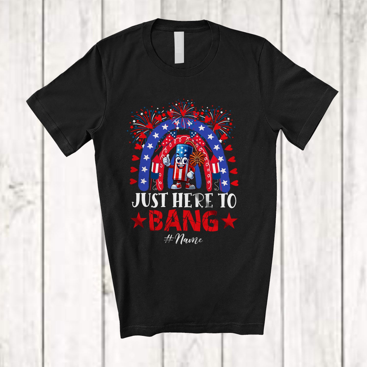 • Personalized Custom Name Just Here To Bang; Proud 4th Of July Firecrackers Rainbow; Patriotic T-Shirt. This cotton t-shirt is a durable staple product with a classic fit. One of the most popular items, it has a relaxed style made for everyday and casual wear.