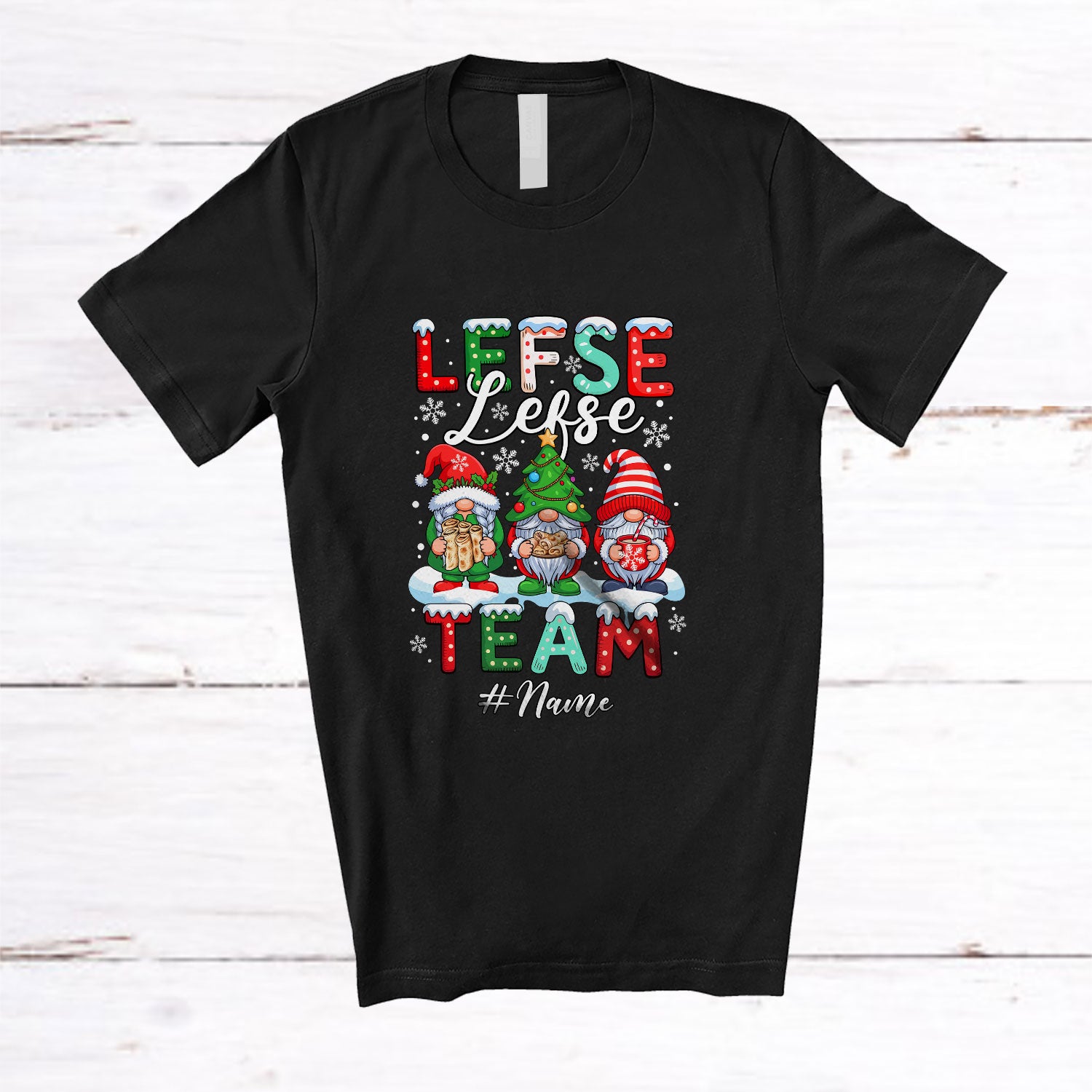 Personalized Custom Name Lefse Team; Joyful Christmas 3 Gnomes Making Taco Nacho Cookie; Baker T-Shirt. This cotton t-shirt is a durable staple product with a classic fit. One of the most popular items, it has a relaxed style made for everyday and casual wear.