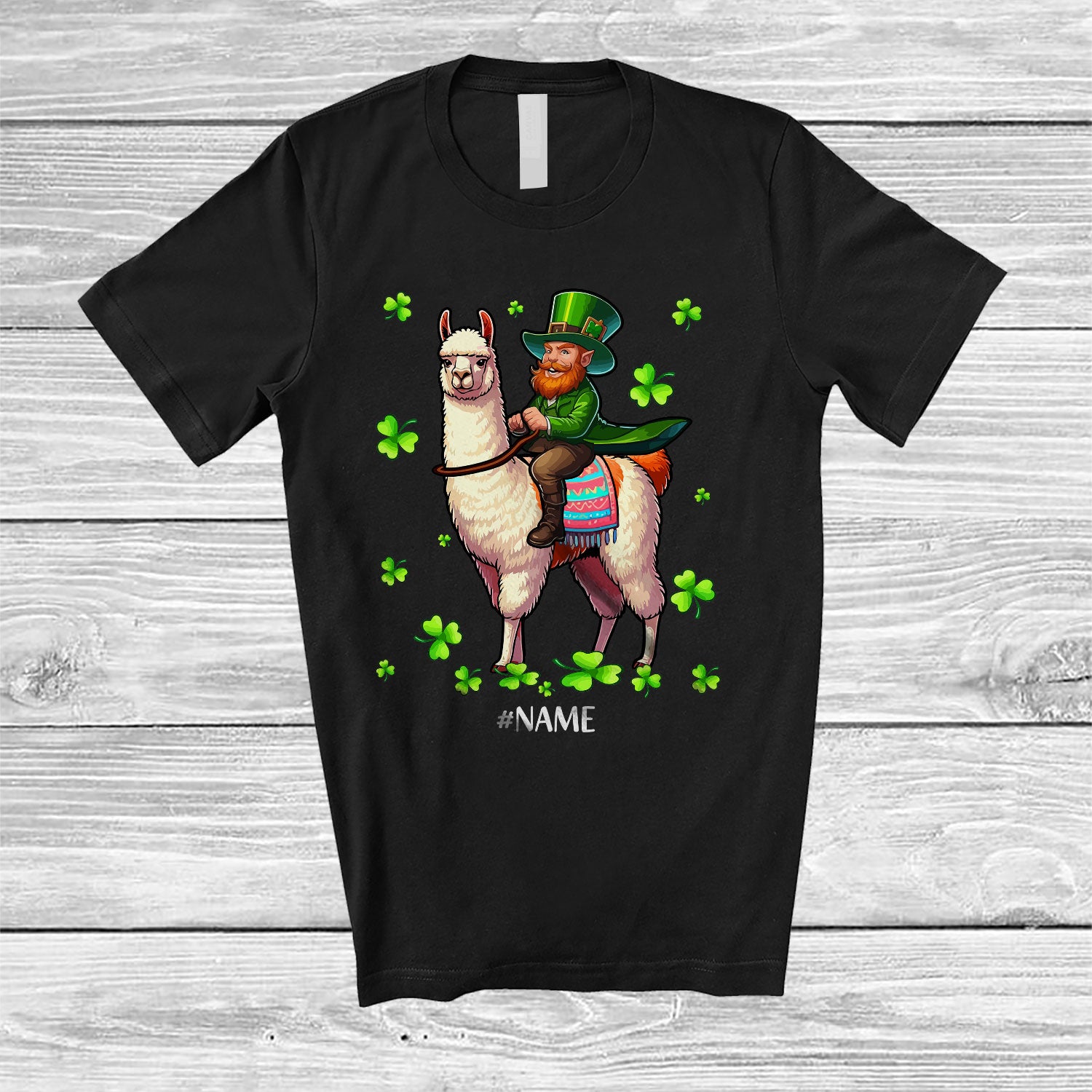 Personalized Custom Name Leprechaun Riding Llama; Lovely St. Patrick's Day Shamrocks; Family T-Shirt. This cotton t-shirt is a durable staple product with a classic fit. One of the most popular items, it has a relaxed style made for everyday and casual wear.