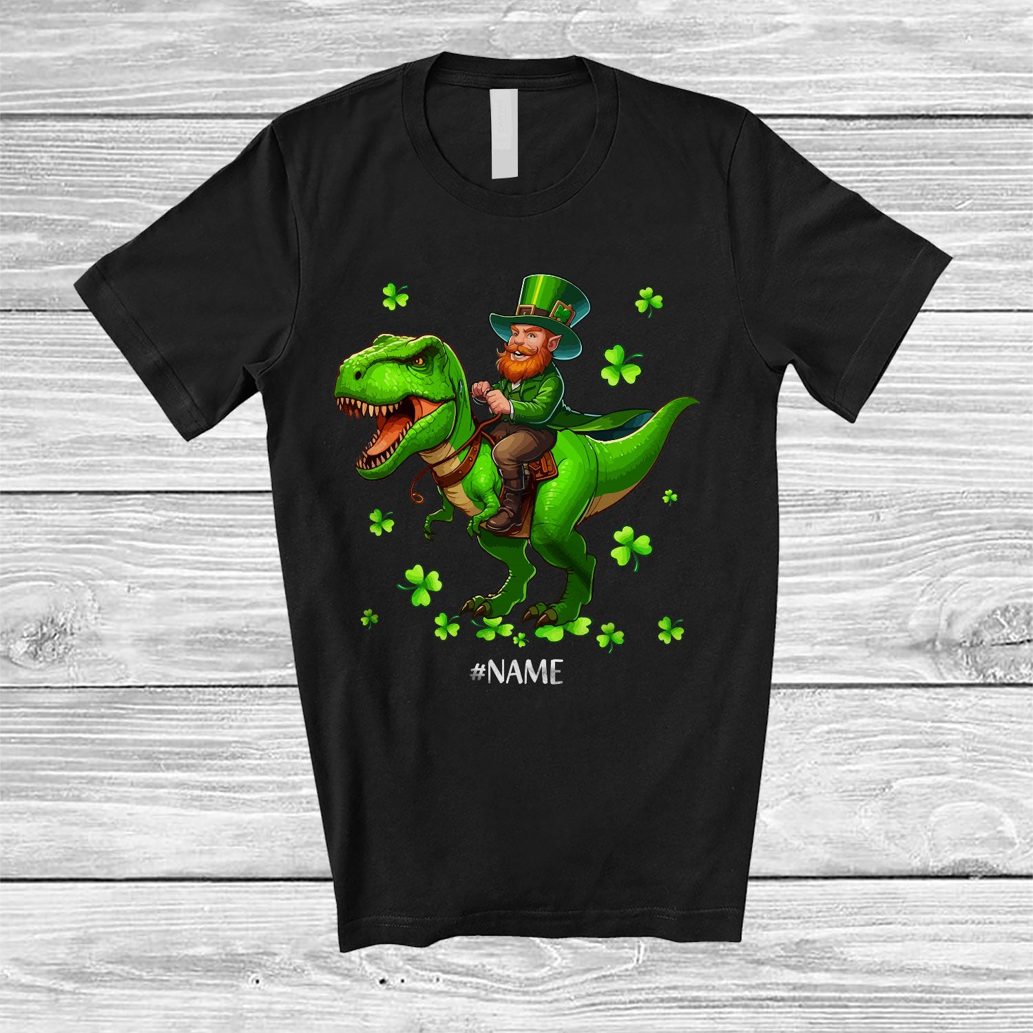 Personalized Custom Name Leprechaun Riding T-Rex; Lovely St. Patrick's Day Shamrocks; Family T-Shirt. This cotton t-shirt is a durable staple product with a classic fit. One of the most popular items, it has a relaxed style made for everyday and casual wear.