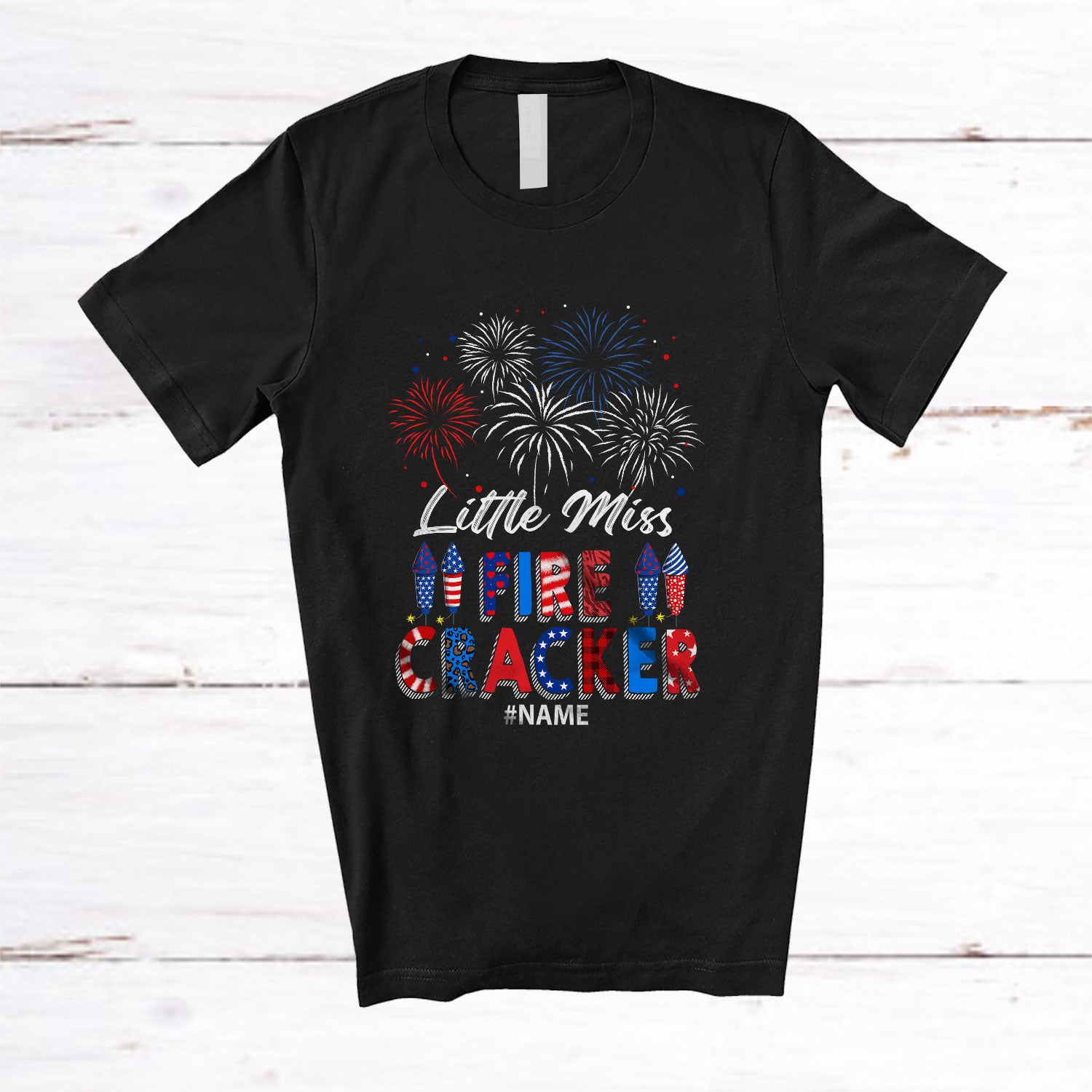 Personalized Custom Name Little Miss Firecracker; Awesome 4th of July Plaid Fireworks; Patriotic T-Shirt. This cotton t-shirt is a durable staple product with a classic fit. One of the most popular items, it has a relaxed style made for everyday and casual wear.