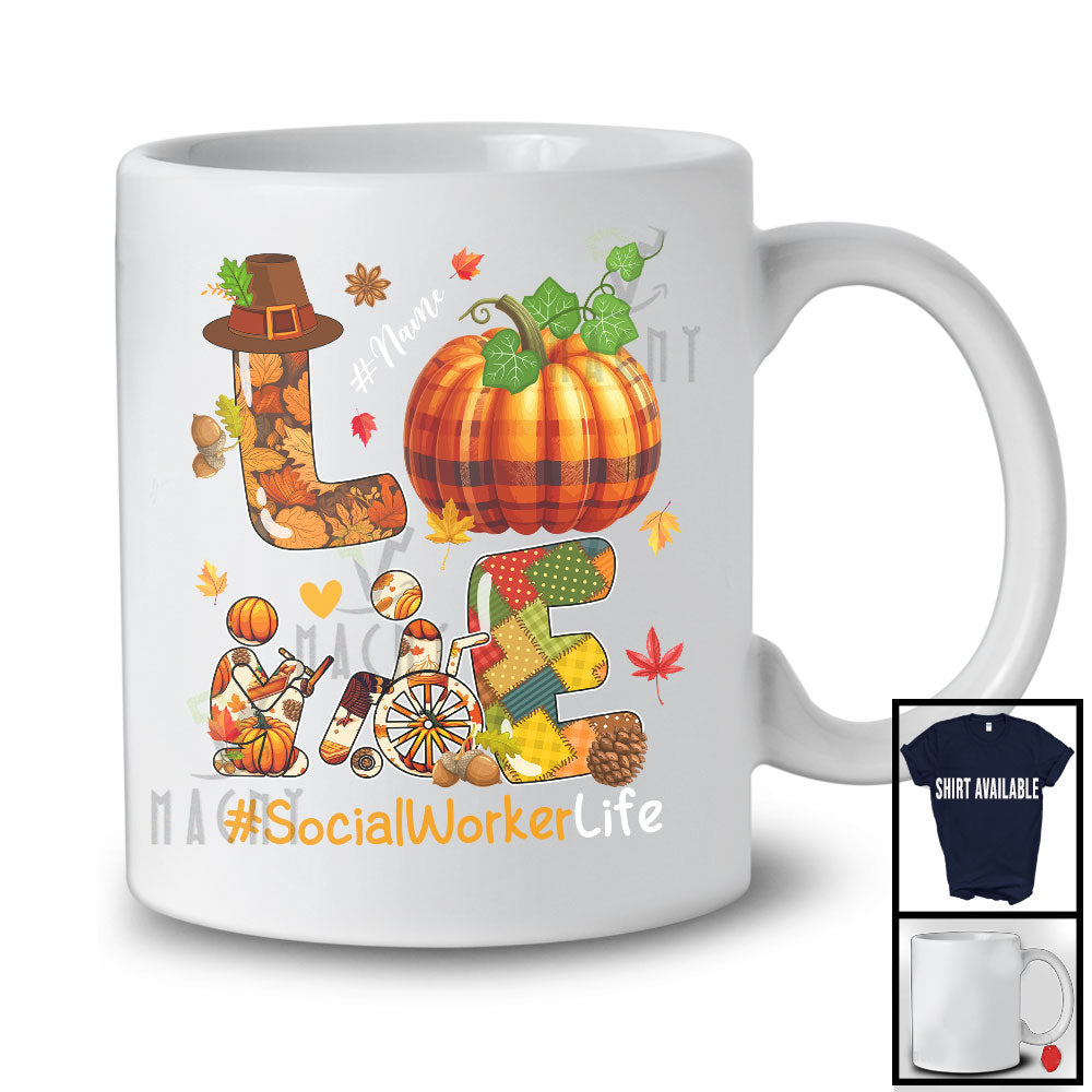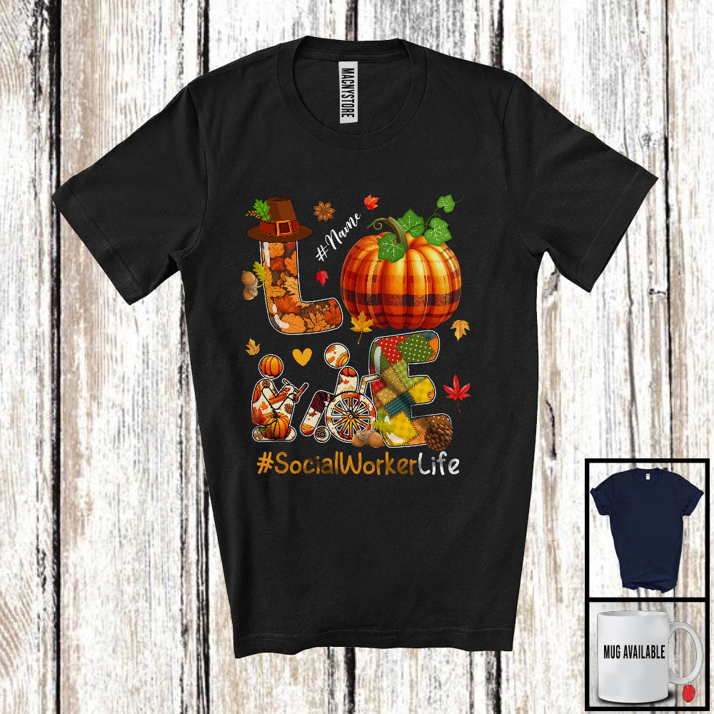 Personalized Custom Name LOVE Social Worker; Happy Thanksgiving Plaid Pumpkin Icon Jobs T-Shirt