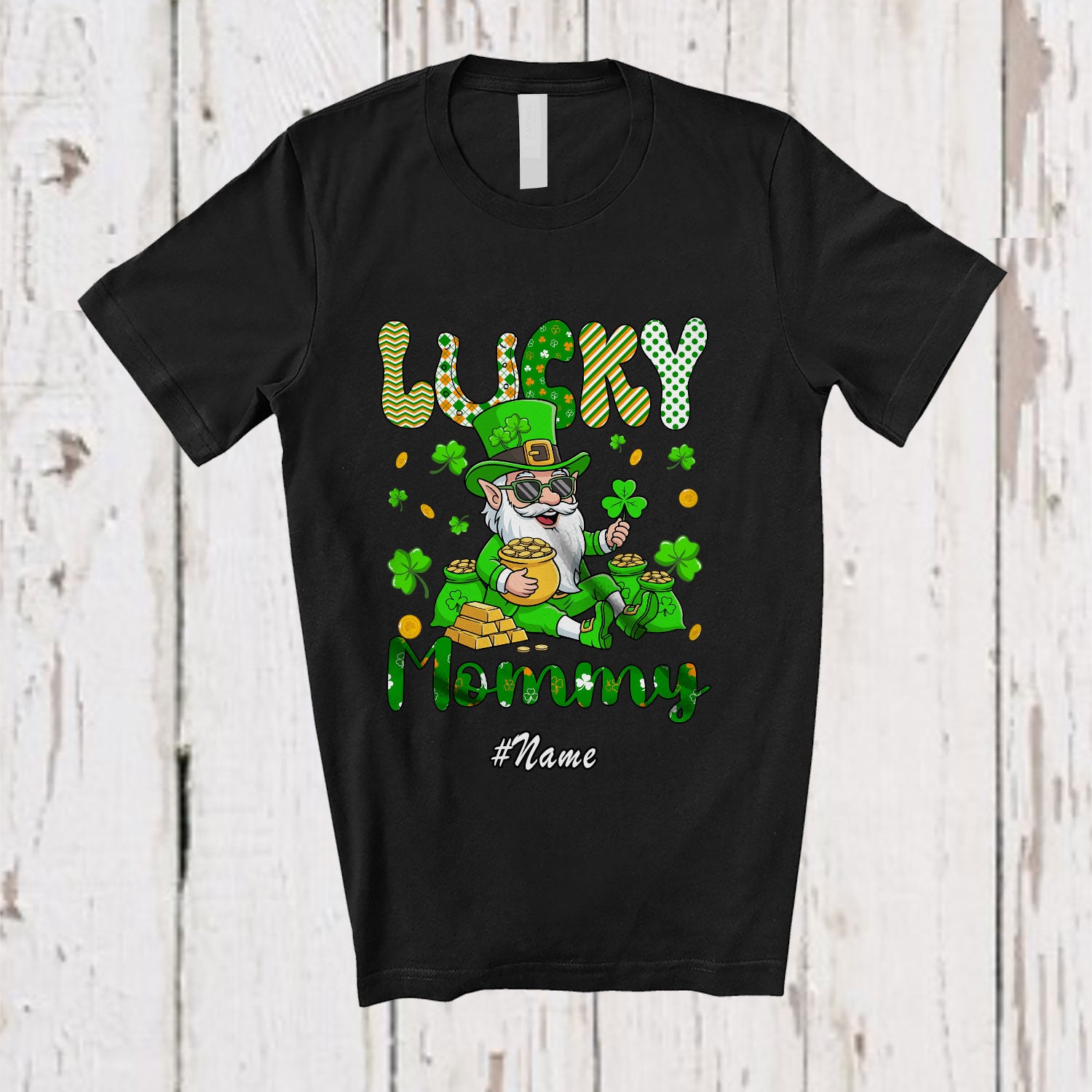 • Personalized Custom Name Lucky Mommy; Lovely St. Patrick's Day Gnome Shamrock; Irish Family T-Shirt. This cotton t-shirt is a durable staple product with a classic fit. One of the most popular items, it has a relaxed style made for everyday and casual wear.