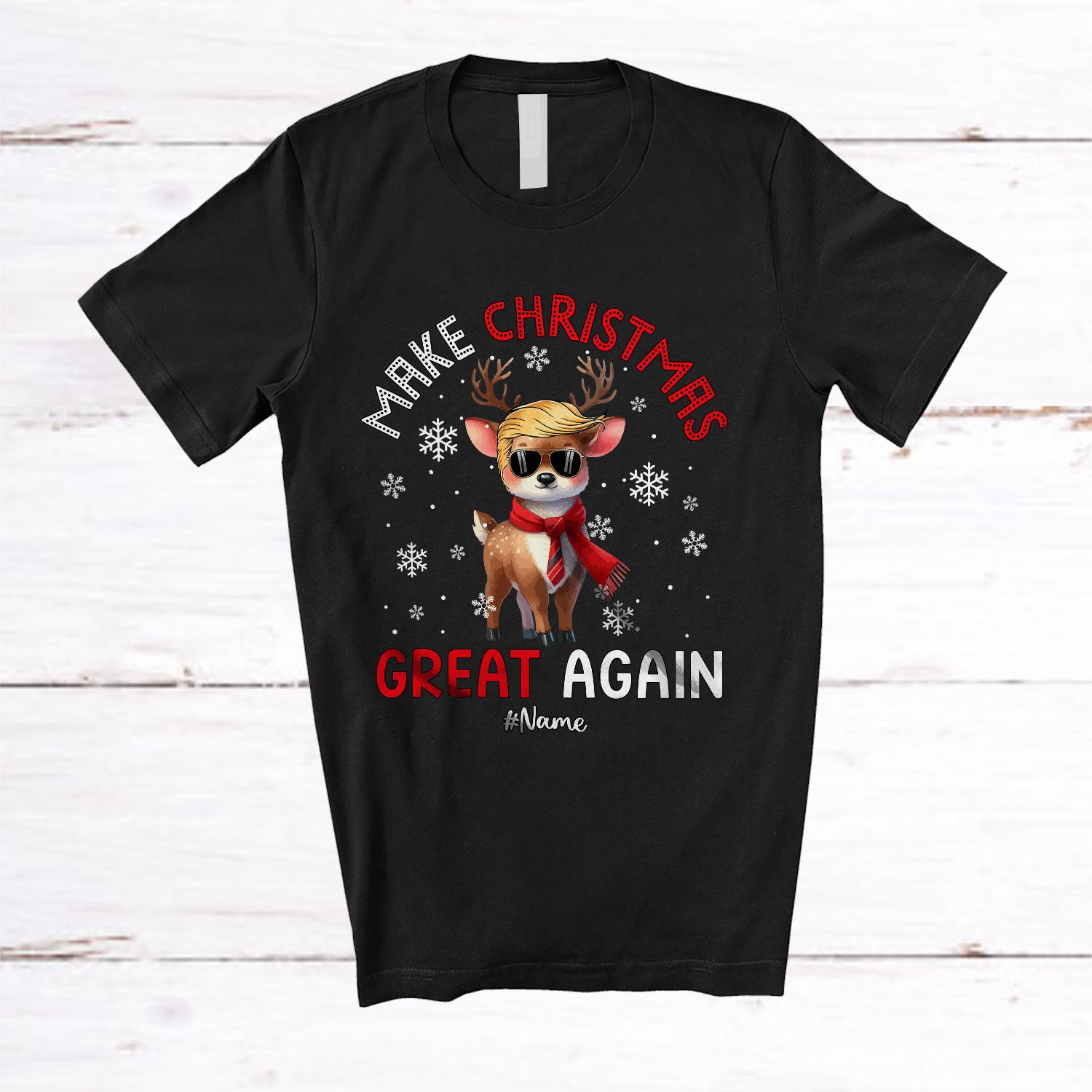 The Personalized Custom Name Make Christmas Great Again; Amusing Reindeer Trump Back 2024; Family T-Shirt destined to impress, and priced at only $12.95, for a limited time.