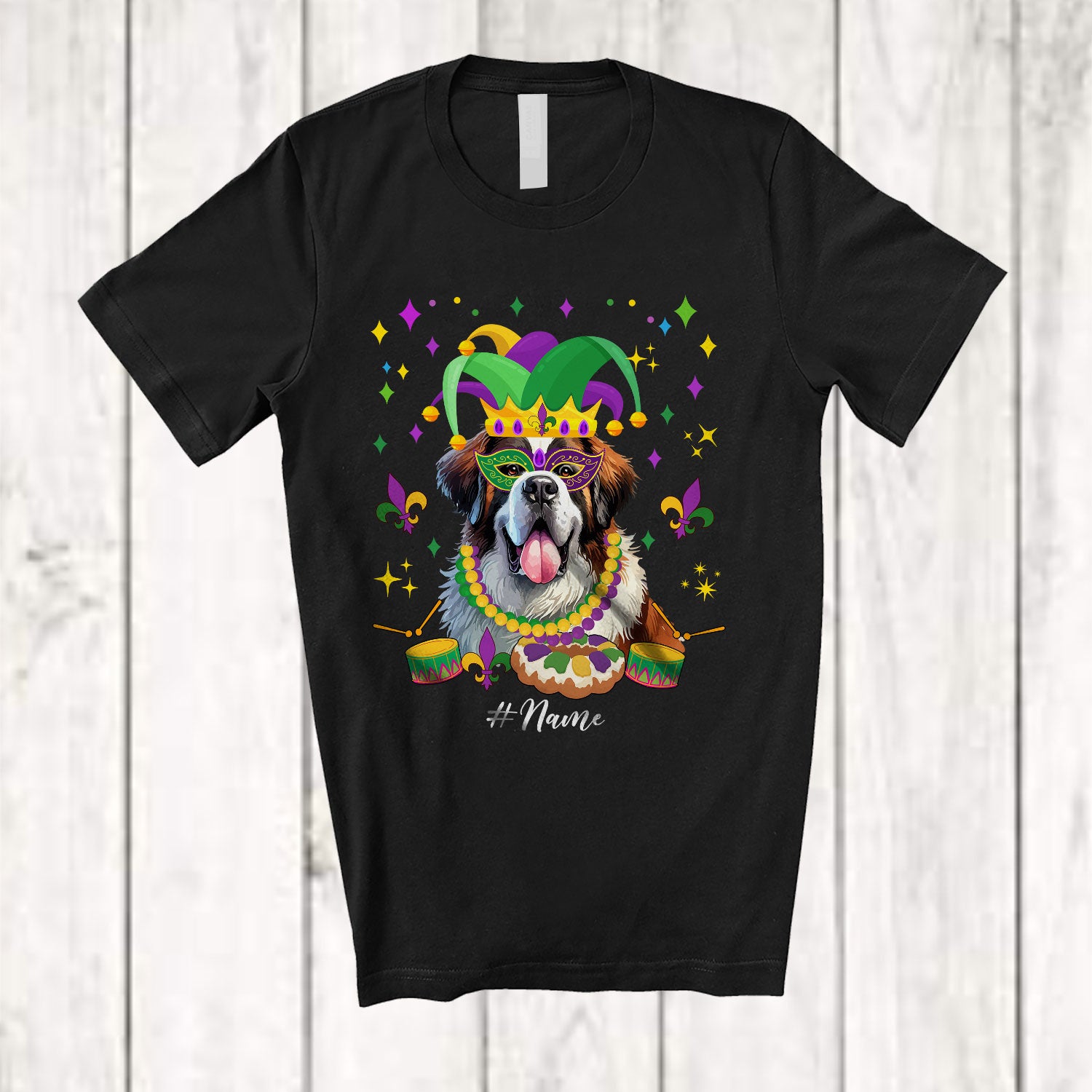 Personalized Custom Name Mardi Gras Mask St. Bernard Face; Joyful Parades Jester Hat Beads T-Shirt. This cotton t-shirt is a durable staple product with a classic fit. One of the most popular items, it has a relaxed style made for everyday and casual wear.