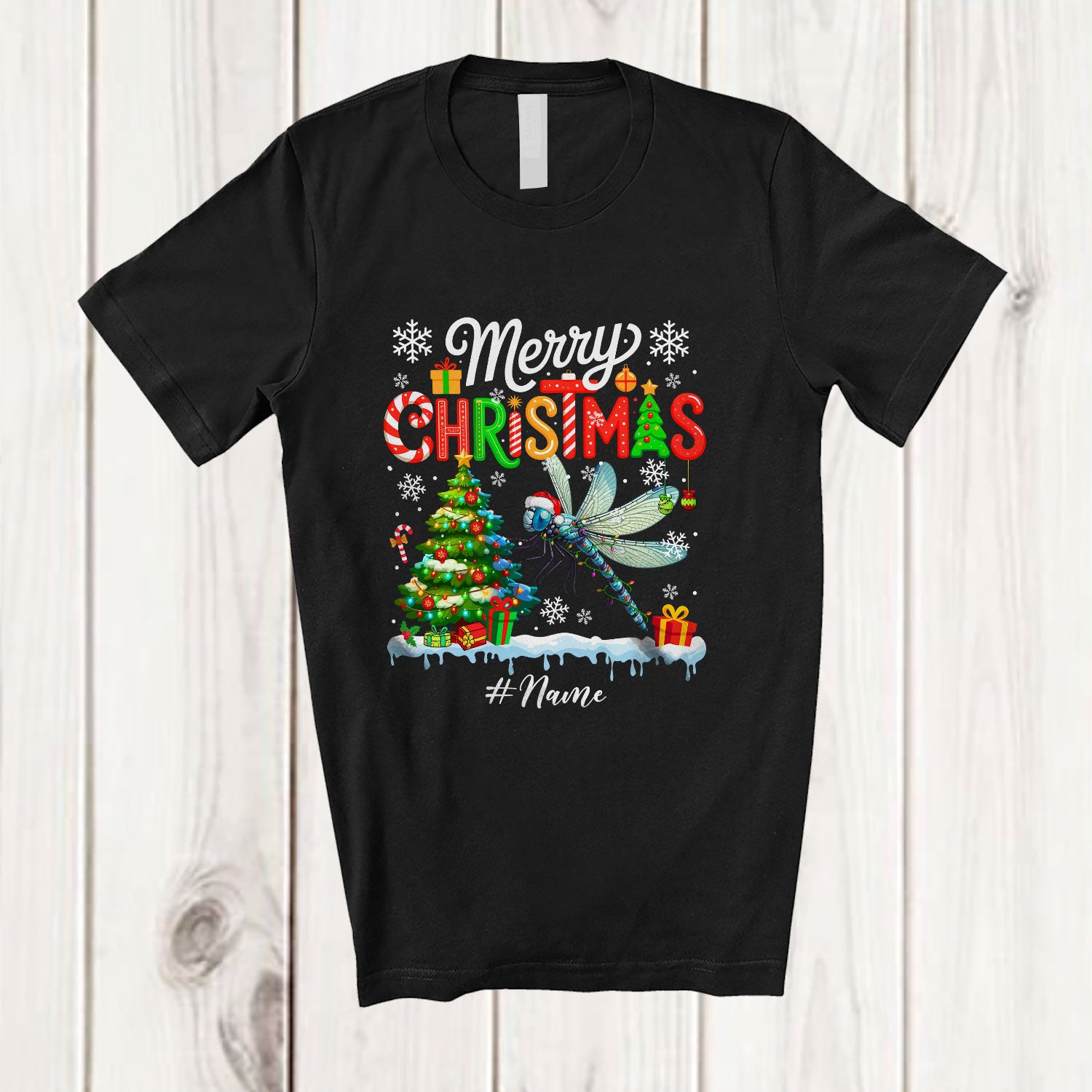 Personalized Custom Name Merry Christmas; Lovely Santa Dragonfly Animal X-mas Lights Tree T-Shirt