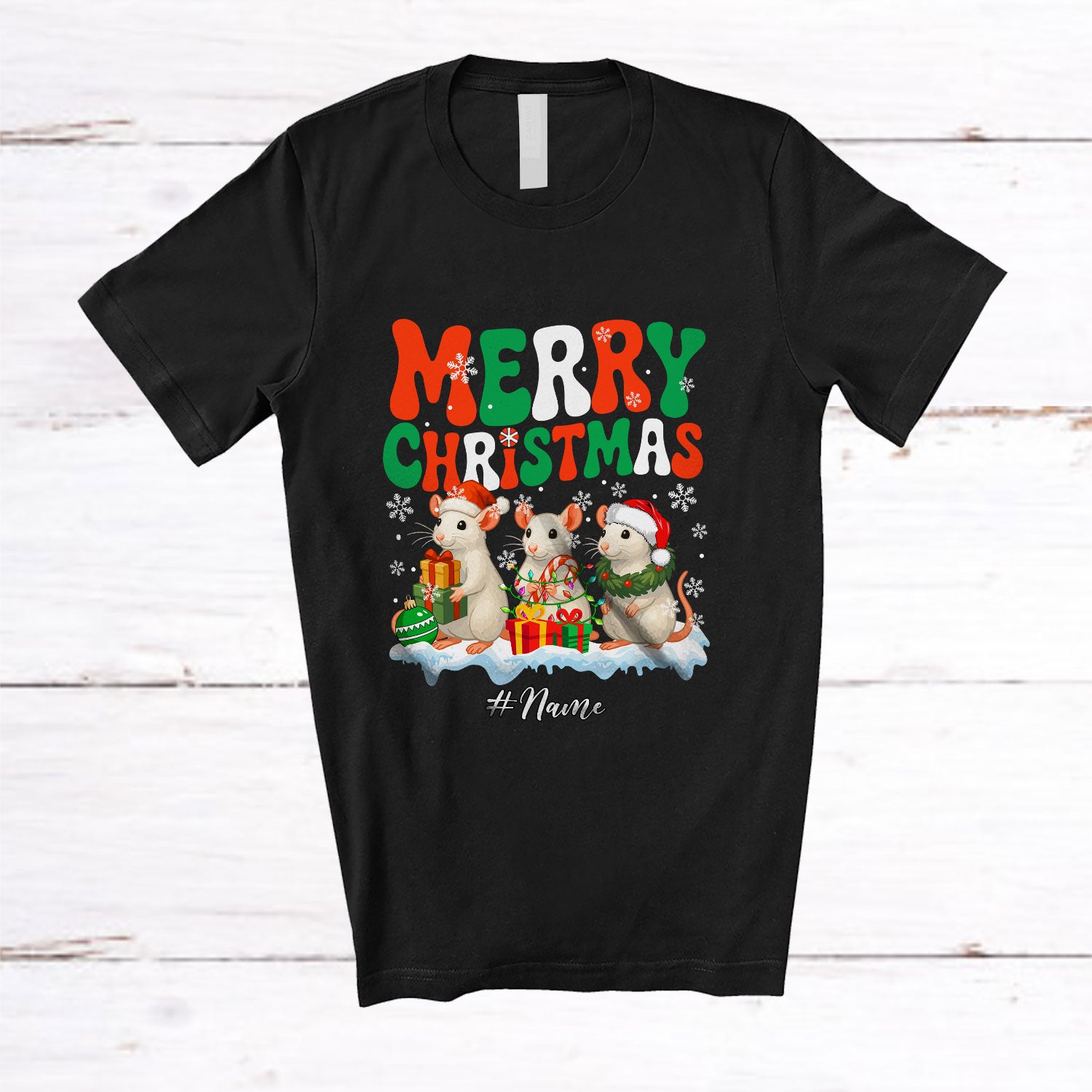 • Personalized Custom Name Merry Christmas; Lovely Three X-mas Rat; Snow Pajamas Family T-Shirt. This cotton t-shirt is a durable staple product with a classic fit. One of the most popular items, it has a relaxed style made for everyday and casual wear.