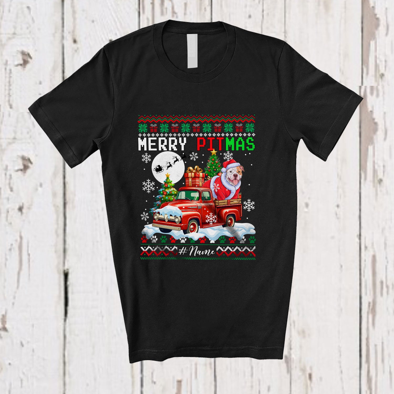 Personalized Custom Name Merry Pitmas; Lovely Christmas Sweater Pit Bull On Pickup Truck T-Shirt